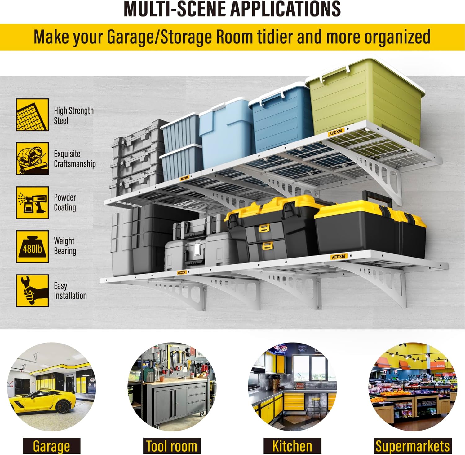 - Premium Materials: Our garage shelving features a rectangular tube frame paired with thick welded wire mesh for superior strength. Finished with a fine sand-texture, high-temperature powder coating, it delivers a sleek, modern, and perfectly flat design