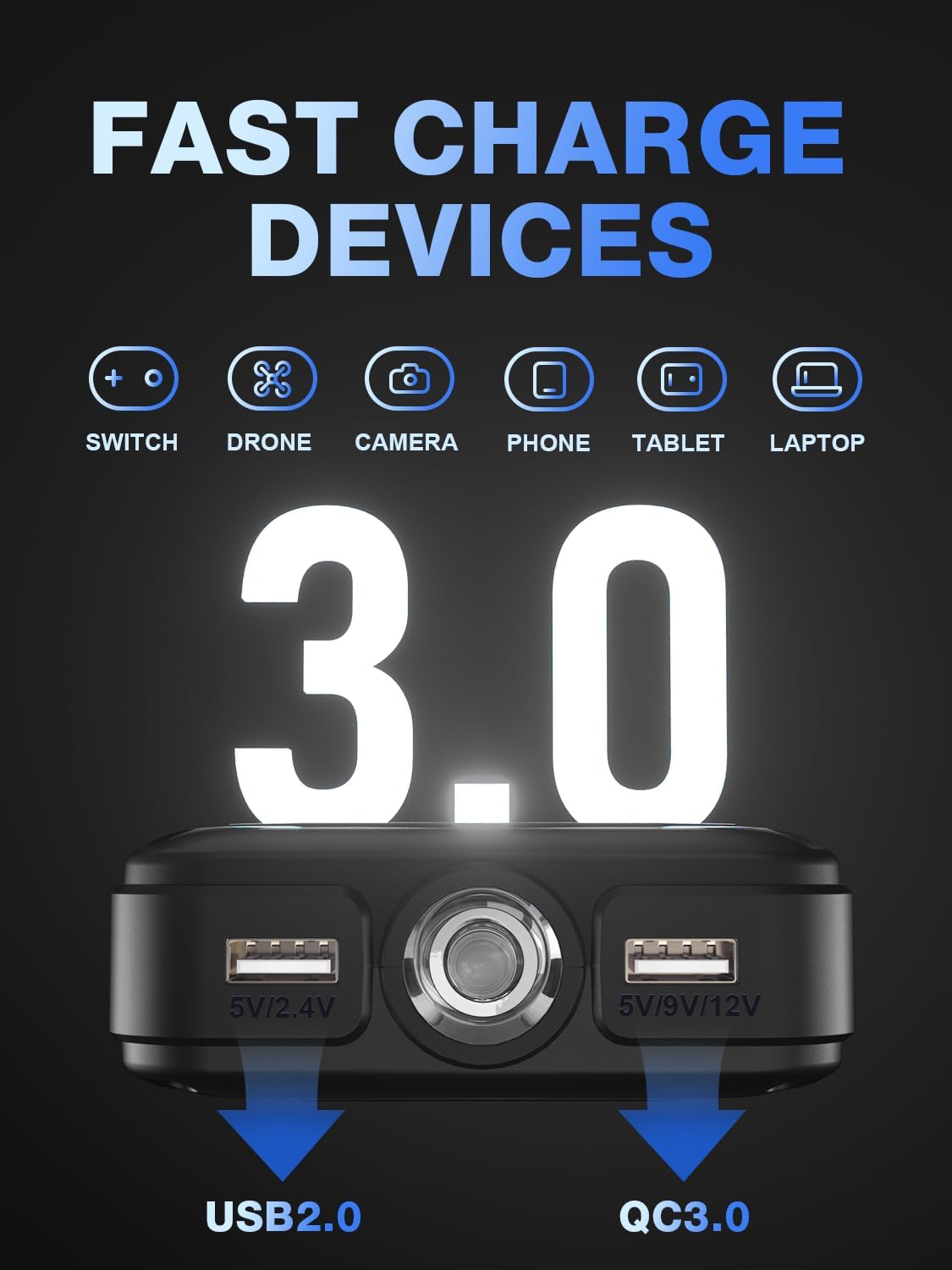 - 【Quick Charge Power Pack】 power bank with dual USB output port,one of the port support QC3.0 (5V 3A;9V/12V 2A)compatible with almost all USB charging device including cellphone, tablet, MP4, PSP etc.High sped 1.8Xcharging time than normal charger. EC-5 Cigarette Lighter Adapter. Connect the peripheral equipment of the car, such as electric vacuum cleaners, air pumps, etc.
