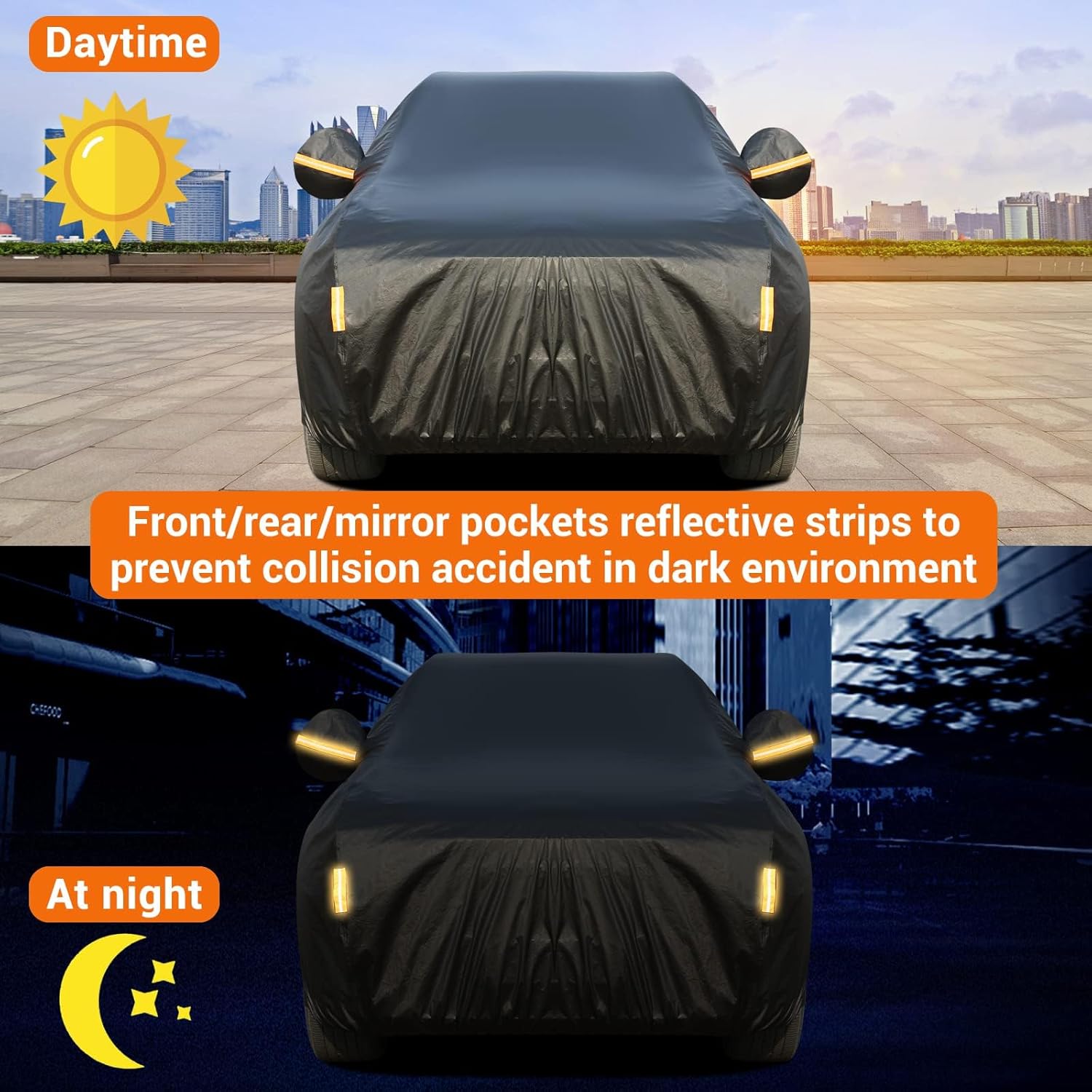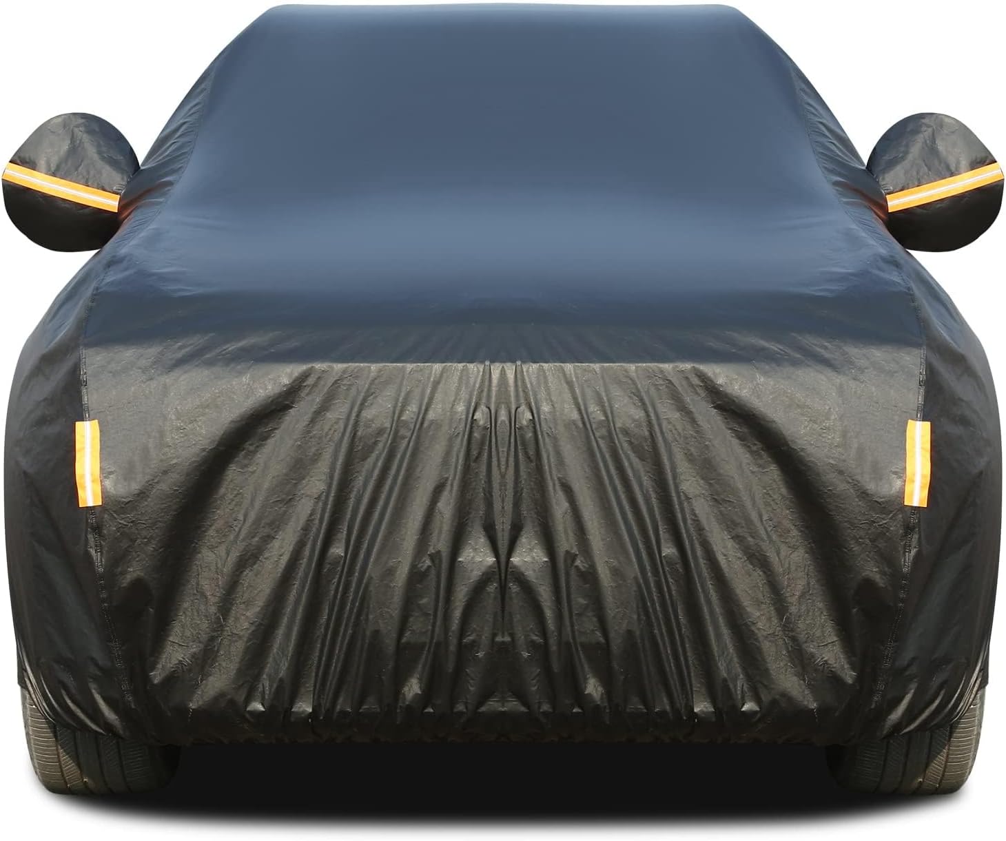 - 360ยฐAll-round Protection: Full exterior covers Protect your vehicle from scratches and dents, sun, rain, snow, rain, frost, bird droppings, sand, dust, leaves, industrial pollution and more with a waterproof all-weather car cover. Black SUV car cover is stain-resistant and easy to clean, and the breathable material improves airflow and reduces condensation while covering.