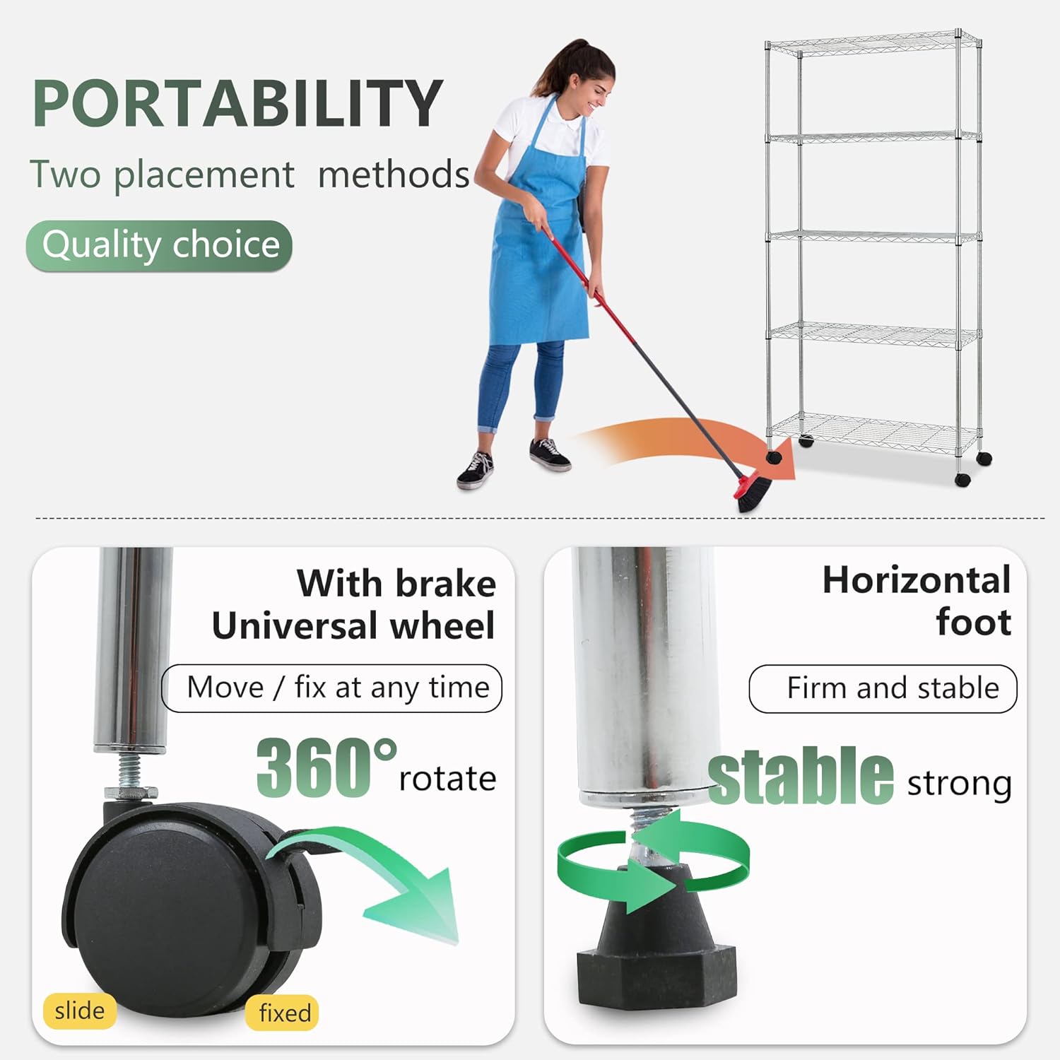 BestOffice 14Dx30Wx60H 5-Tier Wire Shelving Unit Steel Large Metal Shelf Organizer Garage Storage Heavy Duty NSF Height Adjustable Commercial Utility Storage Metal Rack on Wheels,Chrome