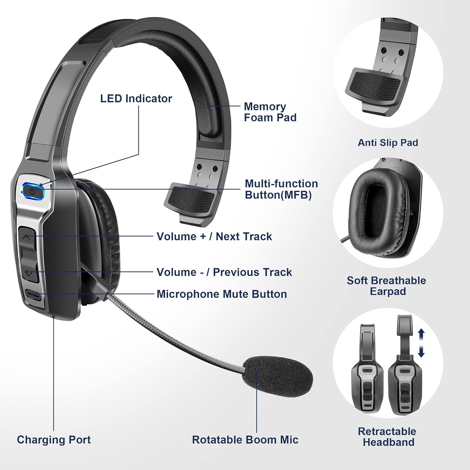 - COMFORTABLE TO WEAR: This Bluetooth headset provides you a comfortable wearing experience for intensive all-day use. The soft-cushion ear pad provides a comfortable around-ear fit for all-day listening. You can adjust the headband to the most comfortable size for your head. And the anti-slip pad will prevent the headphone from slipping off of your head.