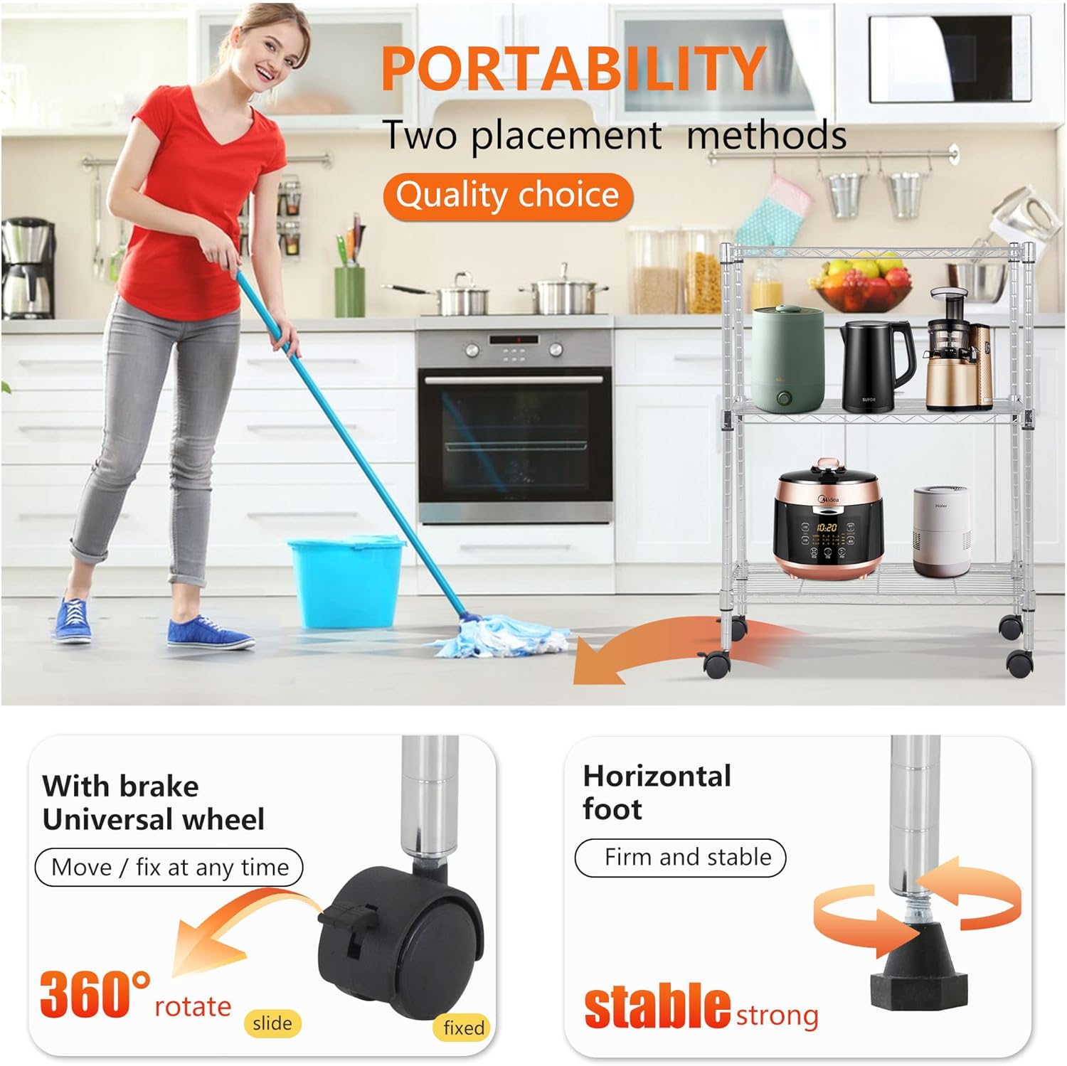 BestOffice 3-Tier Adjustable Wire Shelving Storage Shelves Heavy Duty Shelving Unit with Wheels for Small Places Kitchen Garage Balcony,Chrome