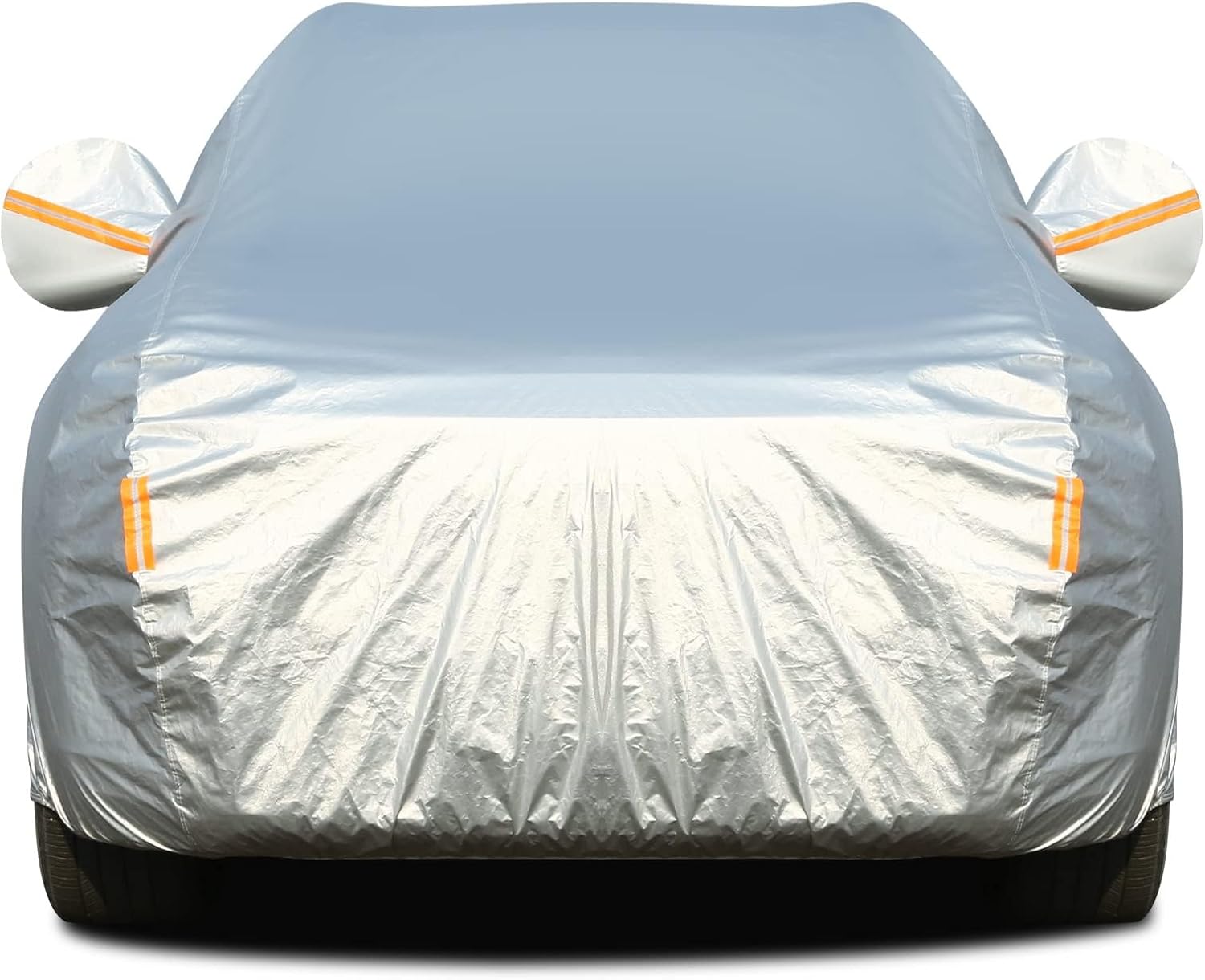 - Upgraded Material: Tecoom 3 layers car cover is made of heavy duty material.The Soft thick cotton fleece lining protects vehicle paintwork. Highly reflective aluminum with good sun protection and UV resistance, protects your car from fading and keeps cool. PE&PEVA 100% waterproof, very suitable for rain, snow and hail. Precise double stitching makes the car cover more durable and won't be damaged by harsh weather.