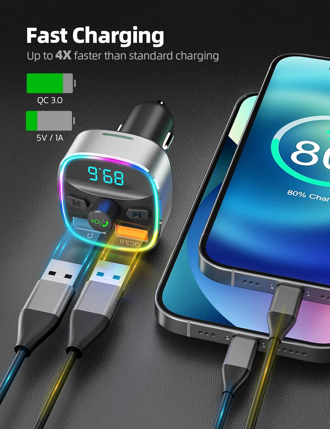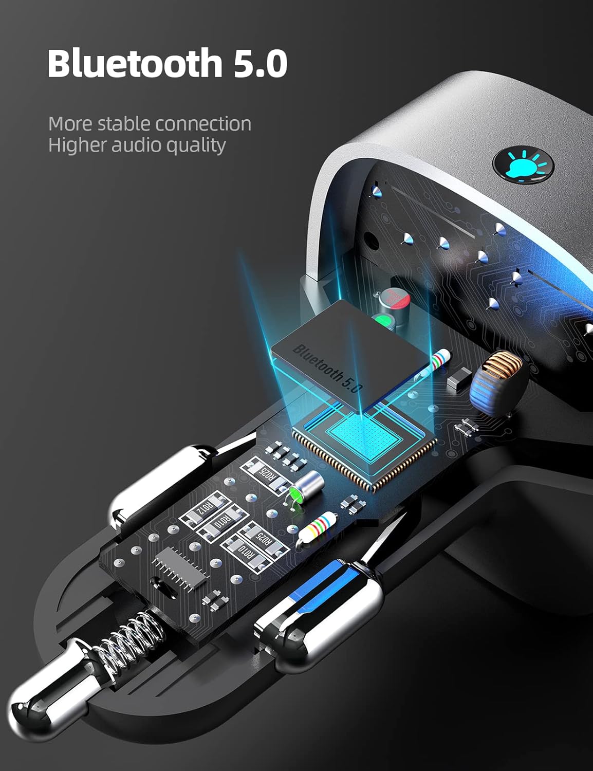 - 7 Color LED Backlit Version: Supporting 7 colors led backlit light, including Red,Green,Blue,Yellowish Green,Purple,Cyan, this Bluetooth fm transmitter will give you a visually stunning display of colors, which is a nice way to match the colors already in the car.