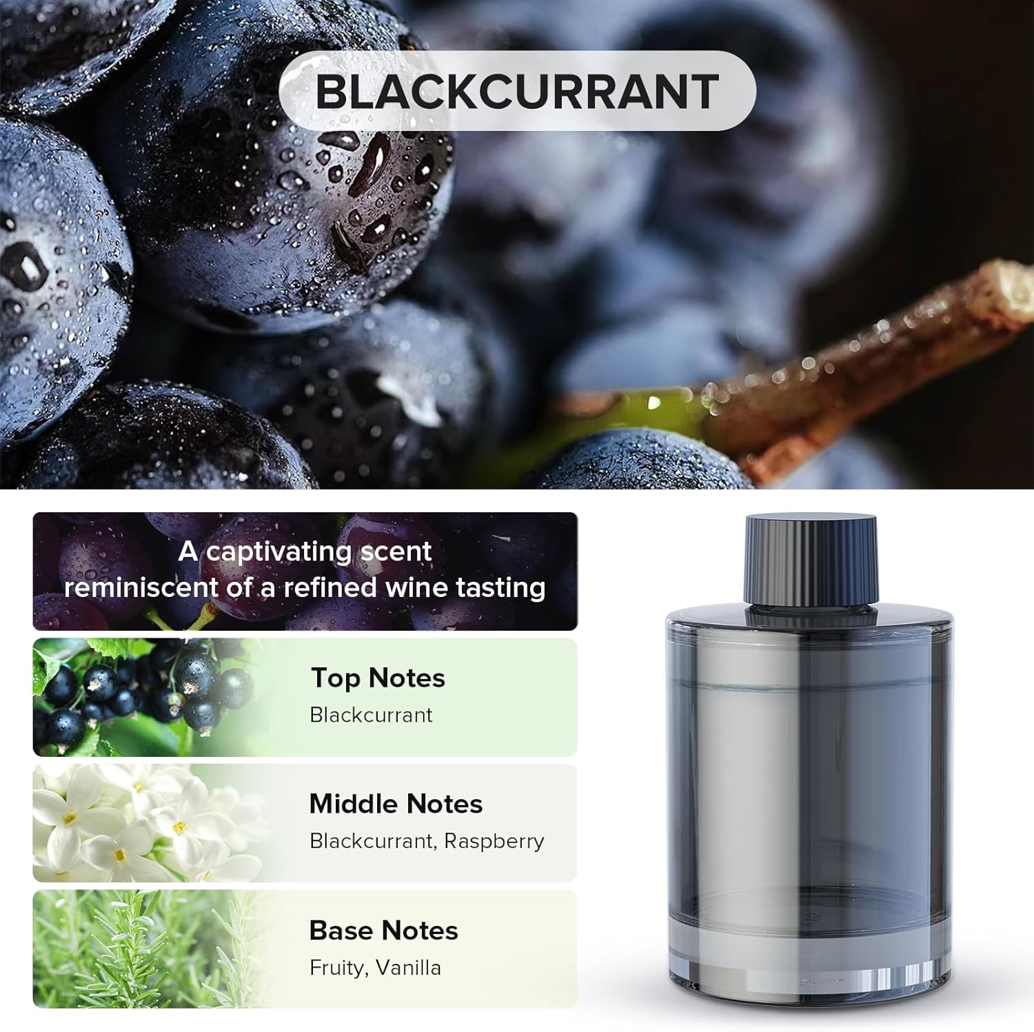 - 【Top Note】Blackcurrant & Middle Note: Blackcurrant, Raspberry, Jasmine & Base Note: Fruity, Vanilla