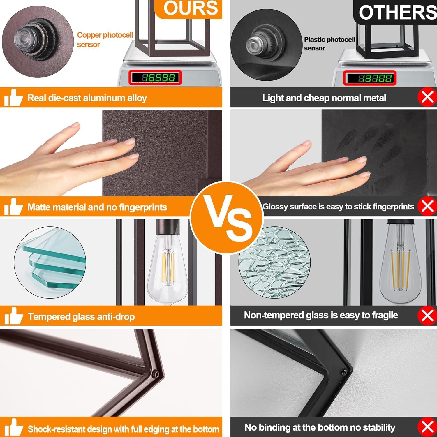 - 🎃【Top-notch Photocell Sensor Technology】Take the upgraded photocell sensor, our outdoor wall light fixtures can sensitively detect the brightness of the surroundings to adjust the switch. Auto turn on at night time when ambient brightness less than 20 LUX, auto turn off at daytime when brightness over 100 LUX. You don't need to turn it on/off manually, free your hands, and save your bills on electricity.