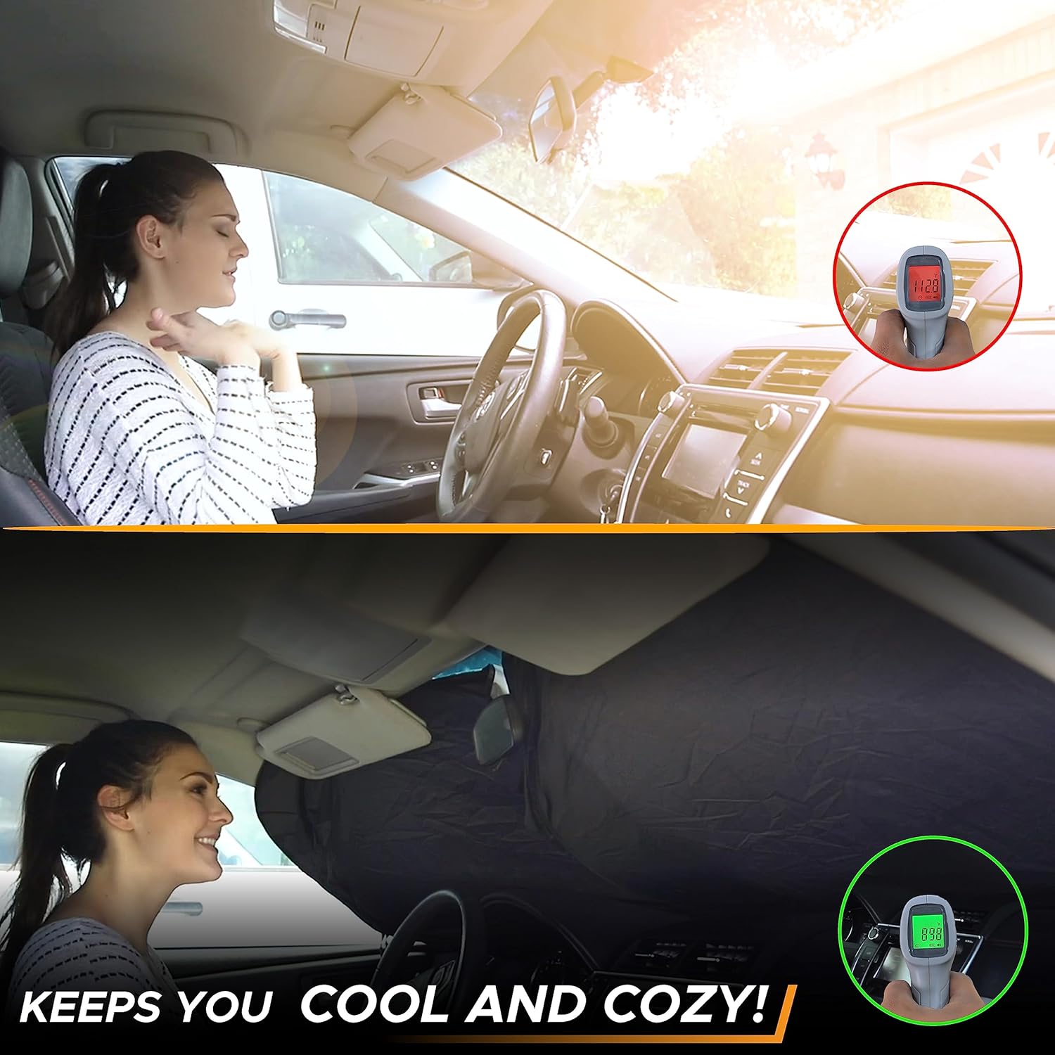 - Effortlessly Install & Store: Say goodbye to complicated installations! Our sun shield for car can be easily installed without any tools and quickly folded into the complementary storage pouch for convenient storage.