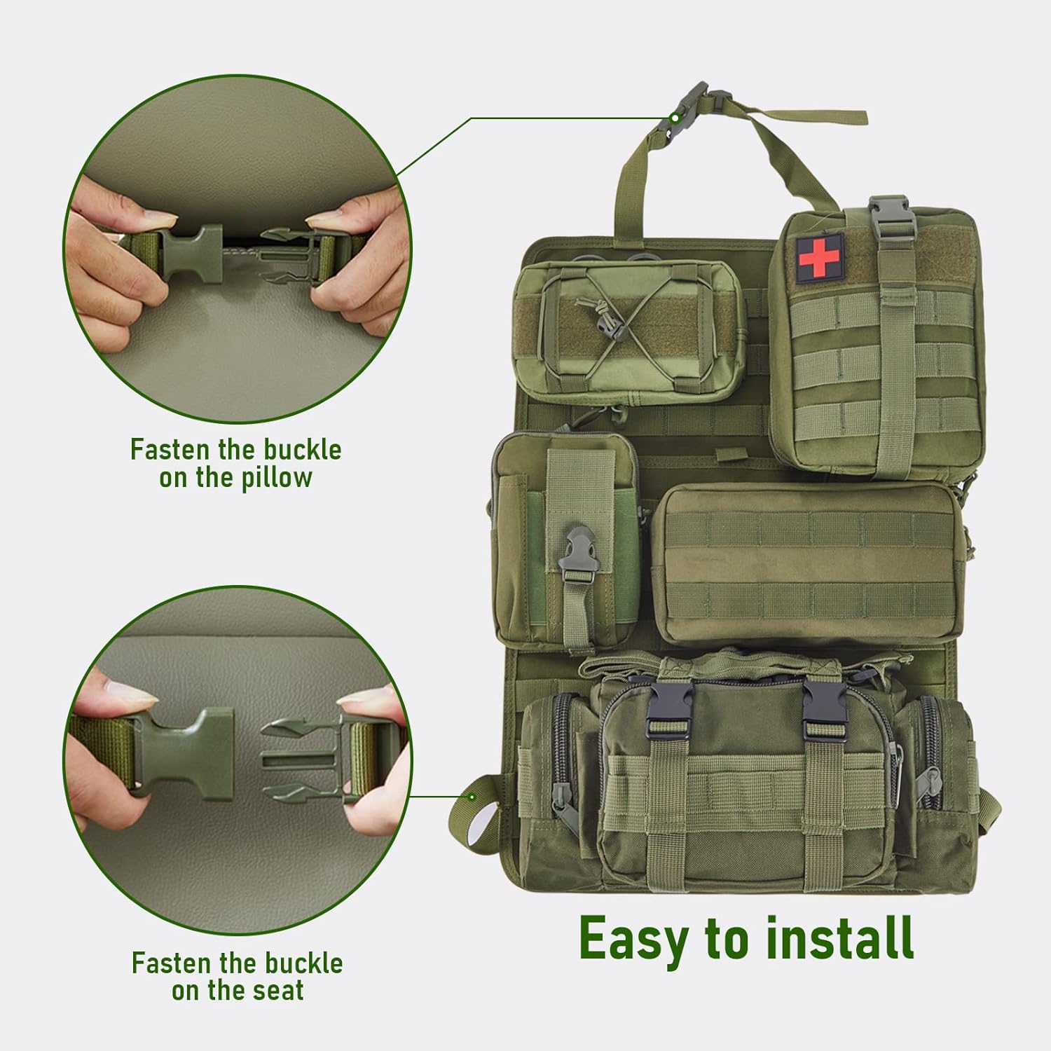 - π Easy Installation - With adjustable strap,easily adjust to fit around your headrest and at the bottom between the seat back and base.Each Molle bags has been designed with velcro tape and buckle, each pouch is flexible to be added or removed.