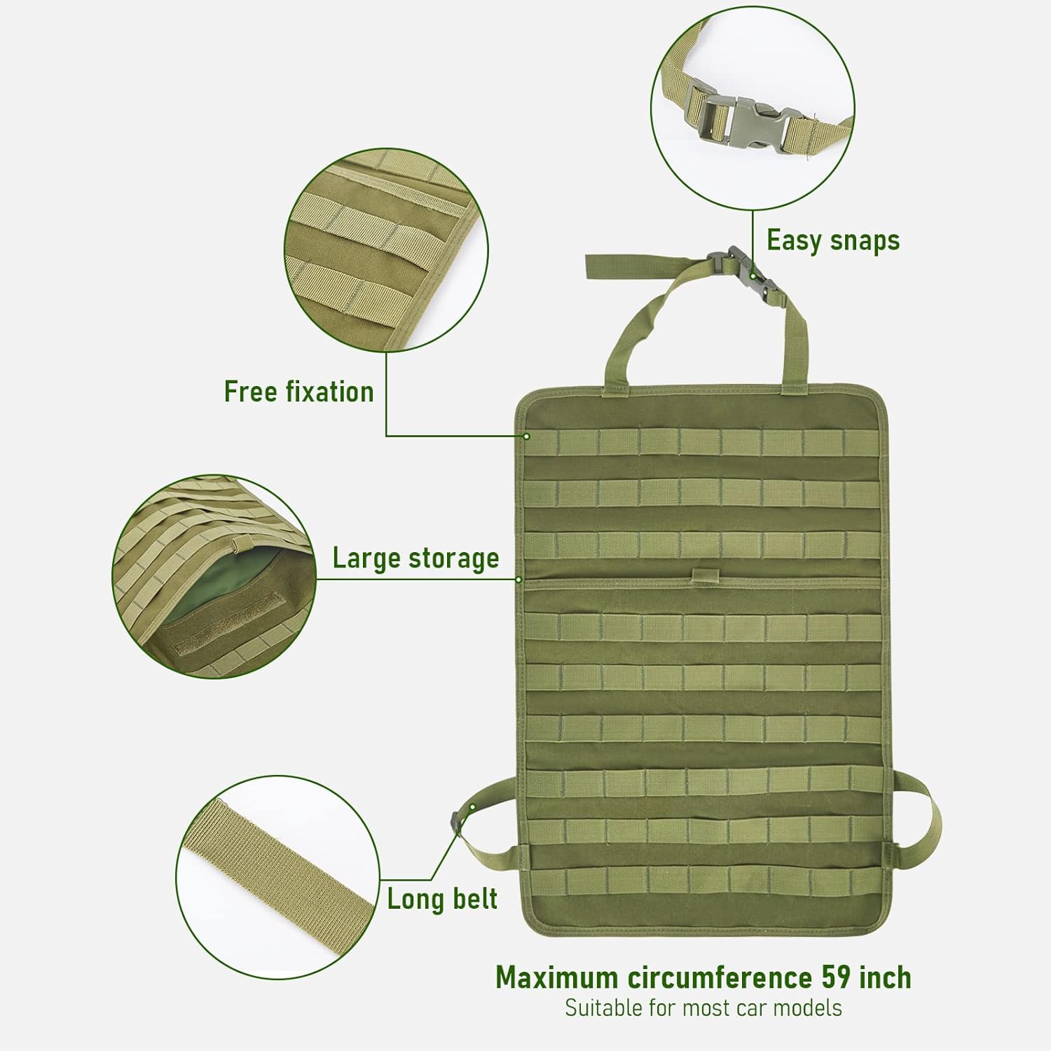 - π Multifunctional Storage - Design with 5 Molle bags on the back to help you store tactical gear & personal items and save space. Difference sizes of Molle bags help you classify your items so easily.you can set the Tactical Seat βBack Organizer according to your own habits and need.