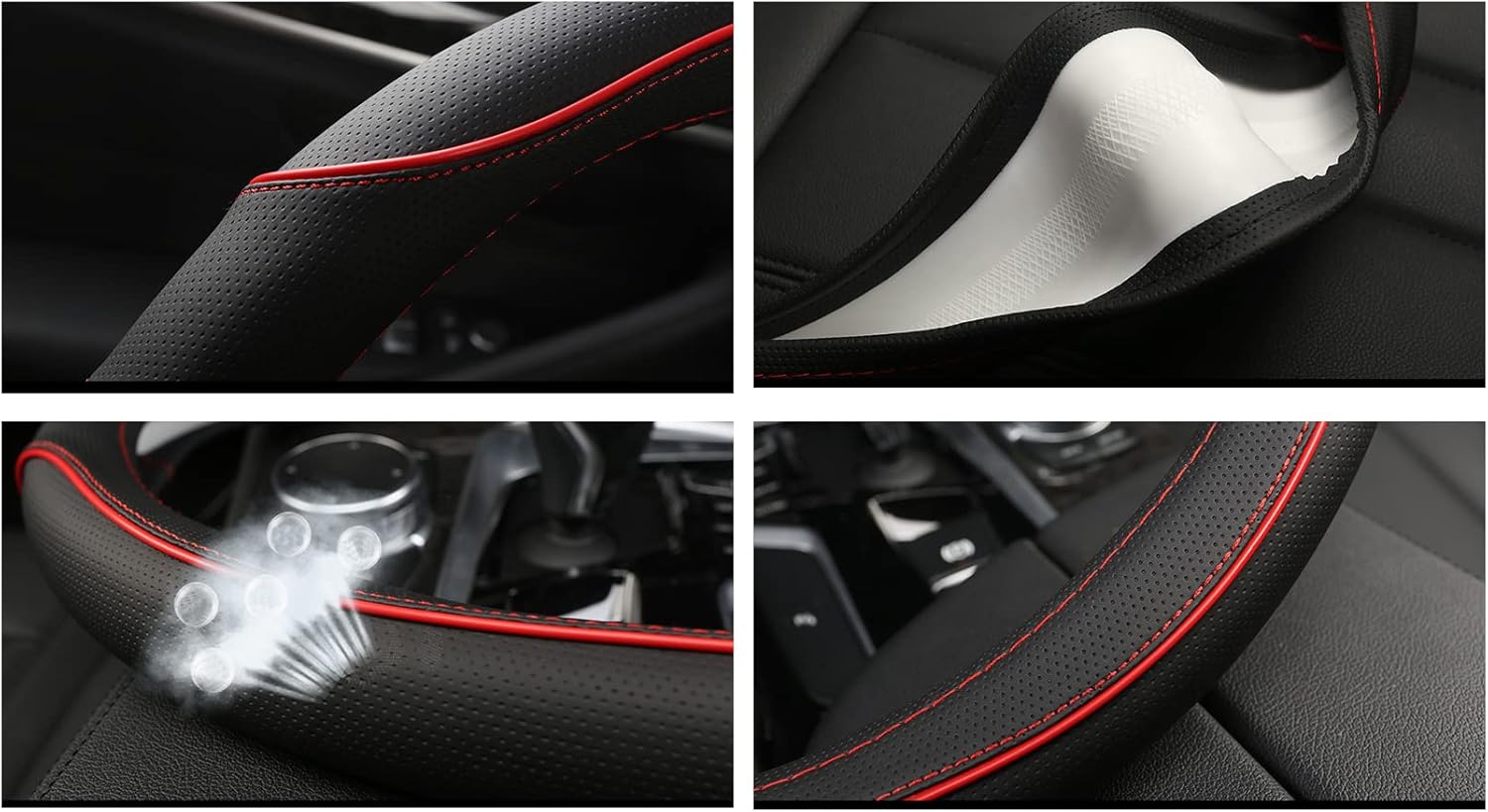 - product design:suitable for 15 inch D-shaped flat bottom steering wheel。 The steering wheel cover is designed with bumps at 2 o'clock and 10 o'clock, 4 o'clock and 8 o'clock, which can better fit the steering wheel and grip, and have a super-class driving experience.