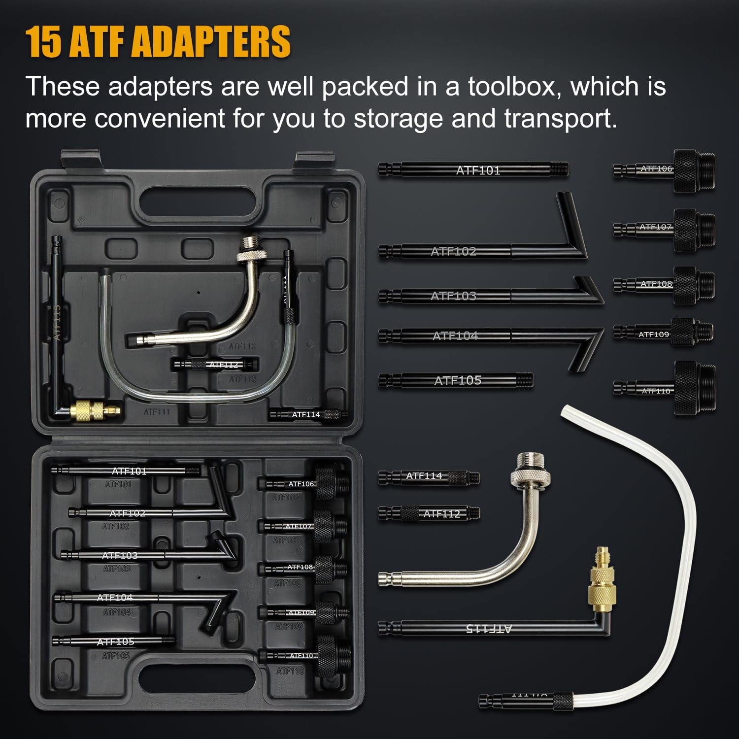 - ATF Adapters: ATF extractor and dispenser tool includes 15 PCS ATF adapters, which are well kept in a blow-molded case. These adapters compatible with Ford, BMW, Nissan, Honda, Audi, Volkswagen DSG, Volkswagen CVT, Skoda, Porsche, Mercedes, Mini Cooper, Kia, Toyota, Hyundai, Infiniti, Volvo and Lexus. Unplug the drain plug at the bottom of the gearbox, drain the used transmission fluid, connect the ATF adapter to the fill or drain port, push the new ATF into the engine by the fluid transfer pump
