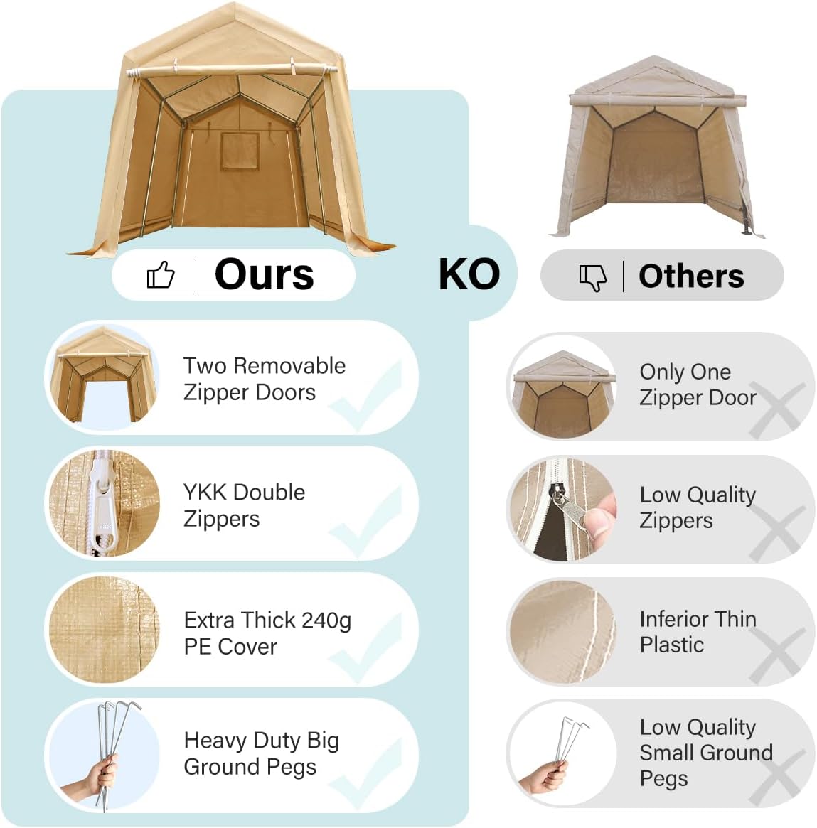- 【2 Removable Roll-up Zipper Doors】✔The doors with double zippers and buckles can be removable or rolled up. Doors at the front and back of the storage shelter for easy entry and exit, better visibility and facilitate air circulation.