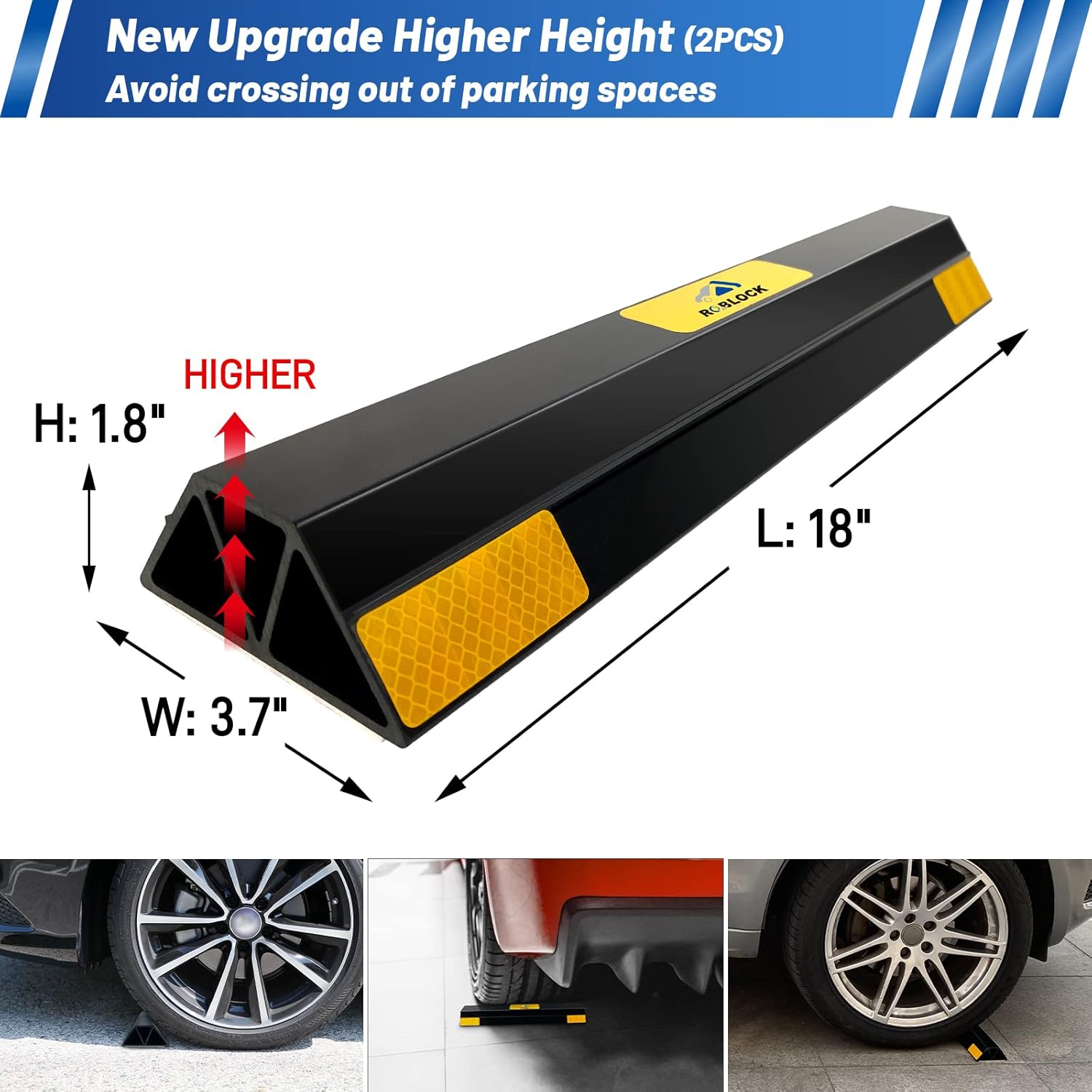 - [MORE SAFER]: The upgraded 18'' parking aid design increases the height to 1.8 inches, can prevent tires from out-running the parking stopper more effectively, avoid hitting the walls or other parked cars. Securing your car to the ground better and making parking more safer every time.