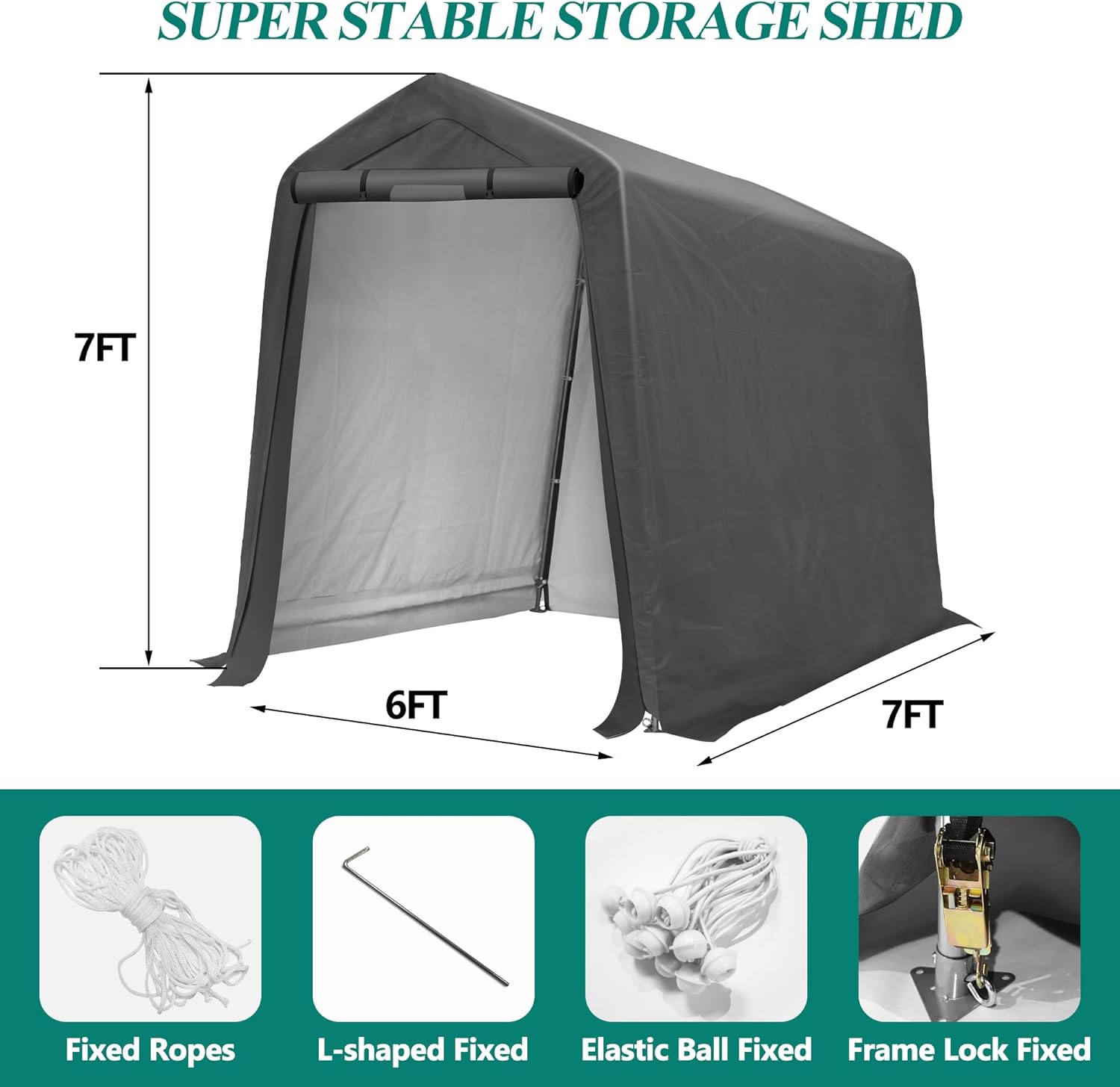 - 🧰STURDY STEEL FRAME: The outdoor storage shelter shed is made of a rust resistant heavy-duty steel frame. SIZE: 6FT*7FT*7FT. The outdoor portable garage storage shed can hold Bike, ATV, Motorcycle Shelter, garden tools, lawnmower, patio furniture storage and so on