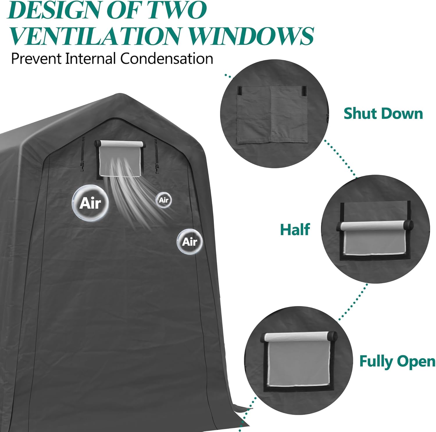 - 🧰170G WATERPROOF CANOPY COVER: Our Storage Shelter is made of waterproof 170g PE tarp with Roll-up Ventilation Windows. Heavy-duty Zipper Design