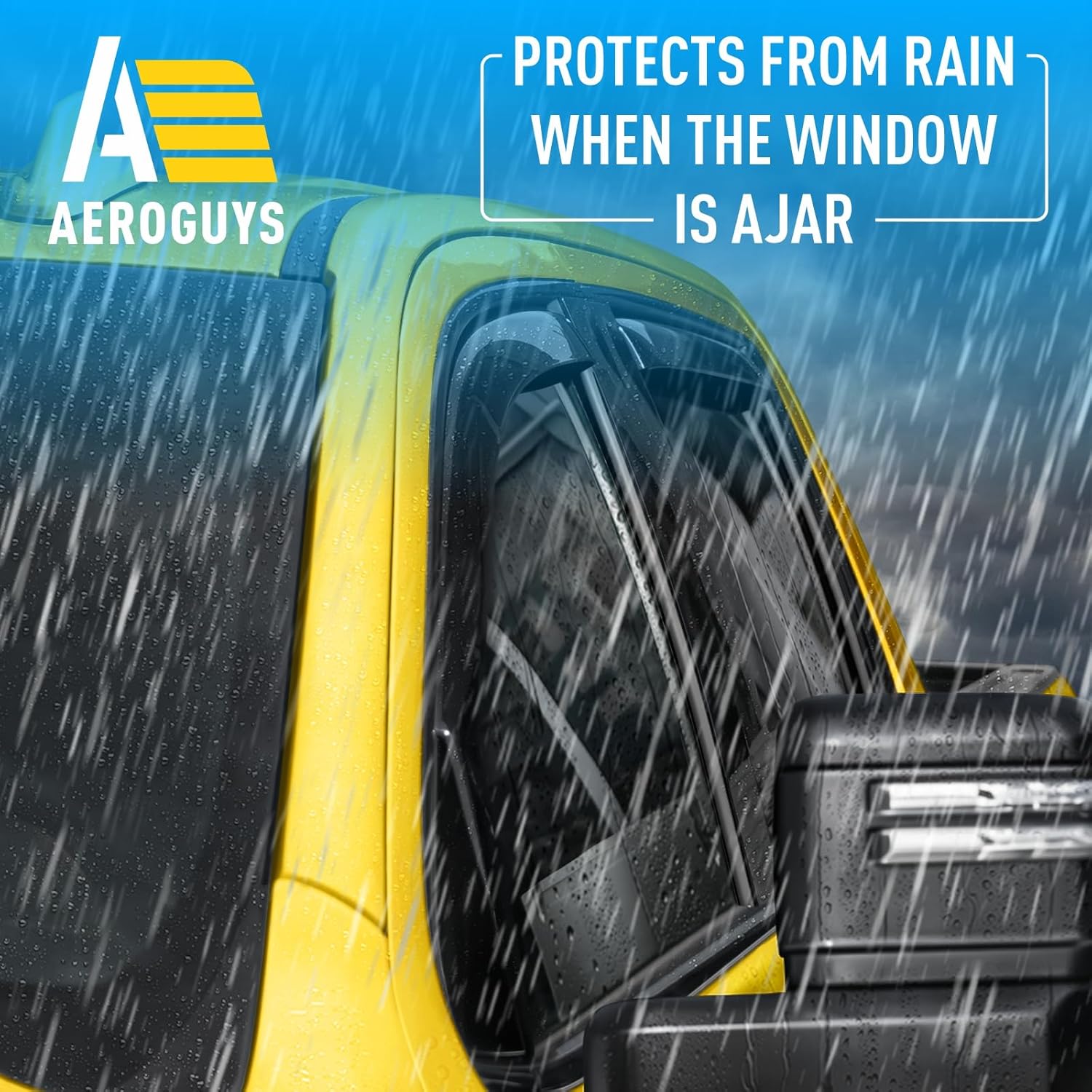 - No Tools Needed, Quick and Easy Assembly β These rain guards are very easy to fit. IN-CHANNEL INSTALLATION provides perfect fit for your truck. Just slip it onto your truckβs window and your job is done within minutes. There is no drilling or no tools required. Be sure that AEROGUYS window deflectors are water resistant, sun protective and will not bend, break or crack regardless of the weather conditions.