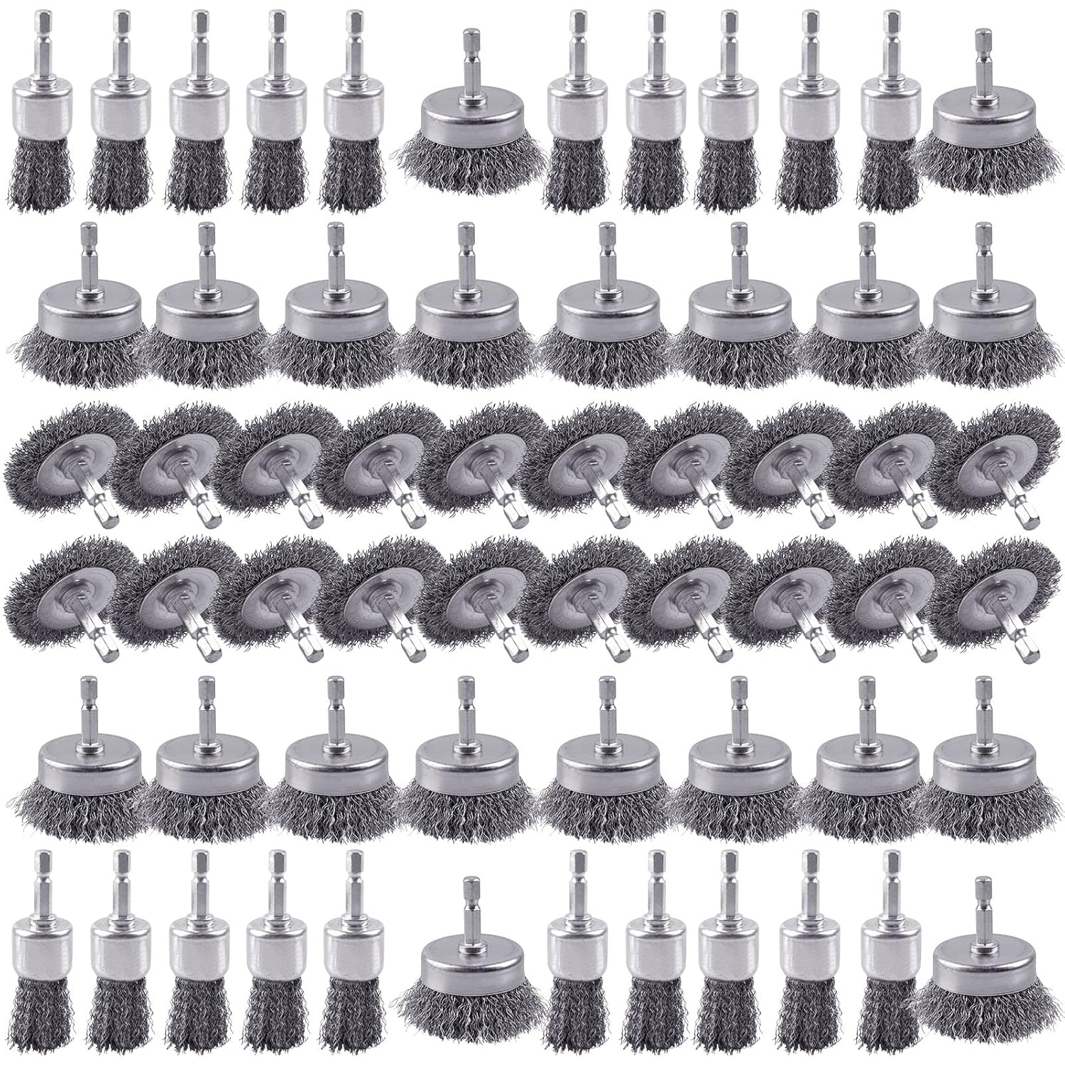 - 60 Pack Wire Brush Set: This package includes: 20 pcs carbon steel cup brush, 20 pcs wheel brush, 20 pcs pen brush with 1/4 inch hex shank. Hardened steel wire long maximum 4500 RPM.