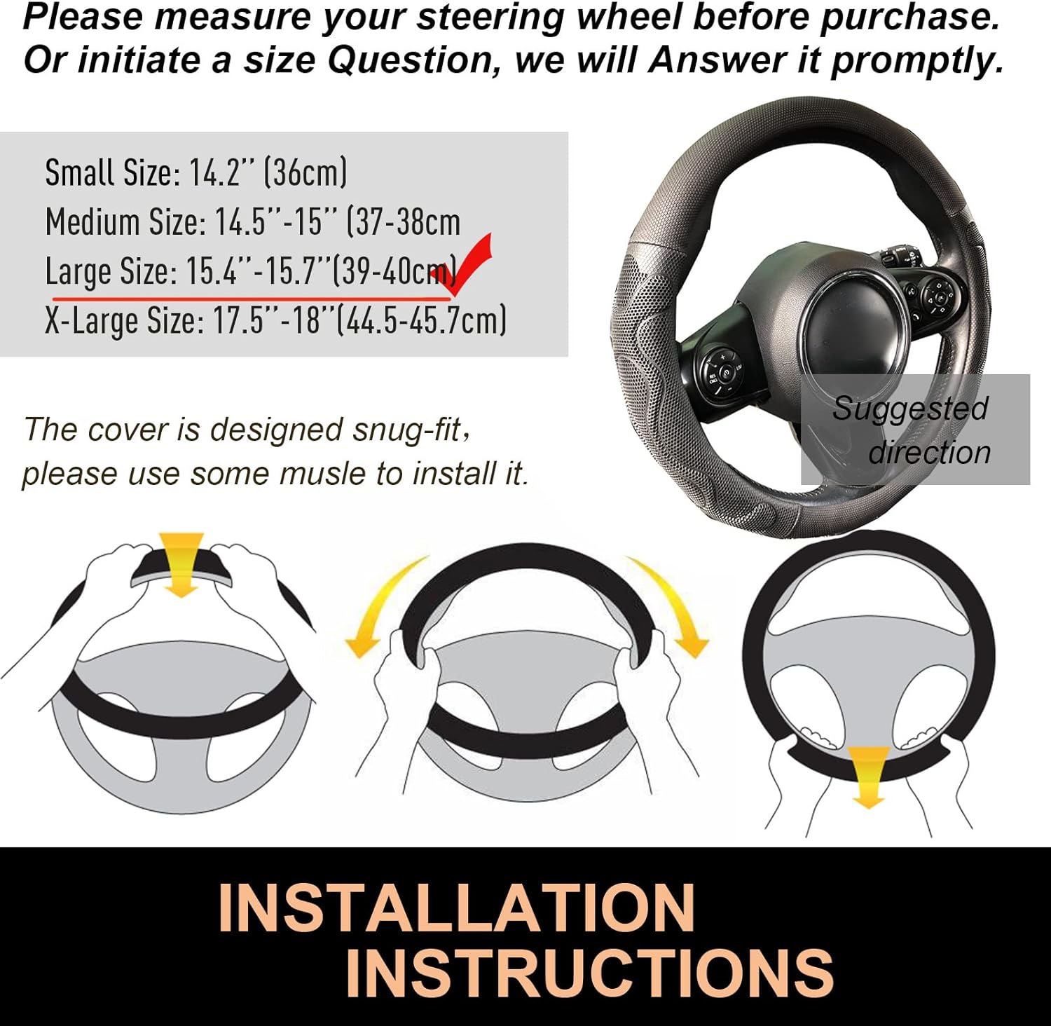 - Size Guidelines: PINCTROT offers a range of options for steering wheel cover, including four sizes: small, medium, large, and X-large, as well as two shapes: round and D-shaped (with a flat bottom). The size you have selected is the LARGE cover, designed specifically for LARGE size steering wheels with an outer diameter of 15 1/2 to 15 3/4 inches (39.4-40cm). Before making your purchase, we kindly advise you to carefully measure the size of your steering wheel to ensure a proper fit.