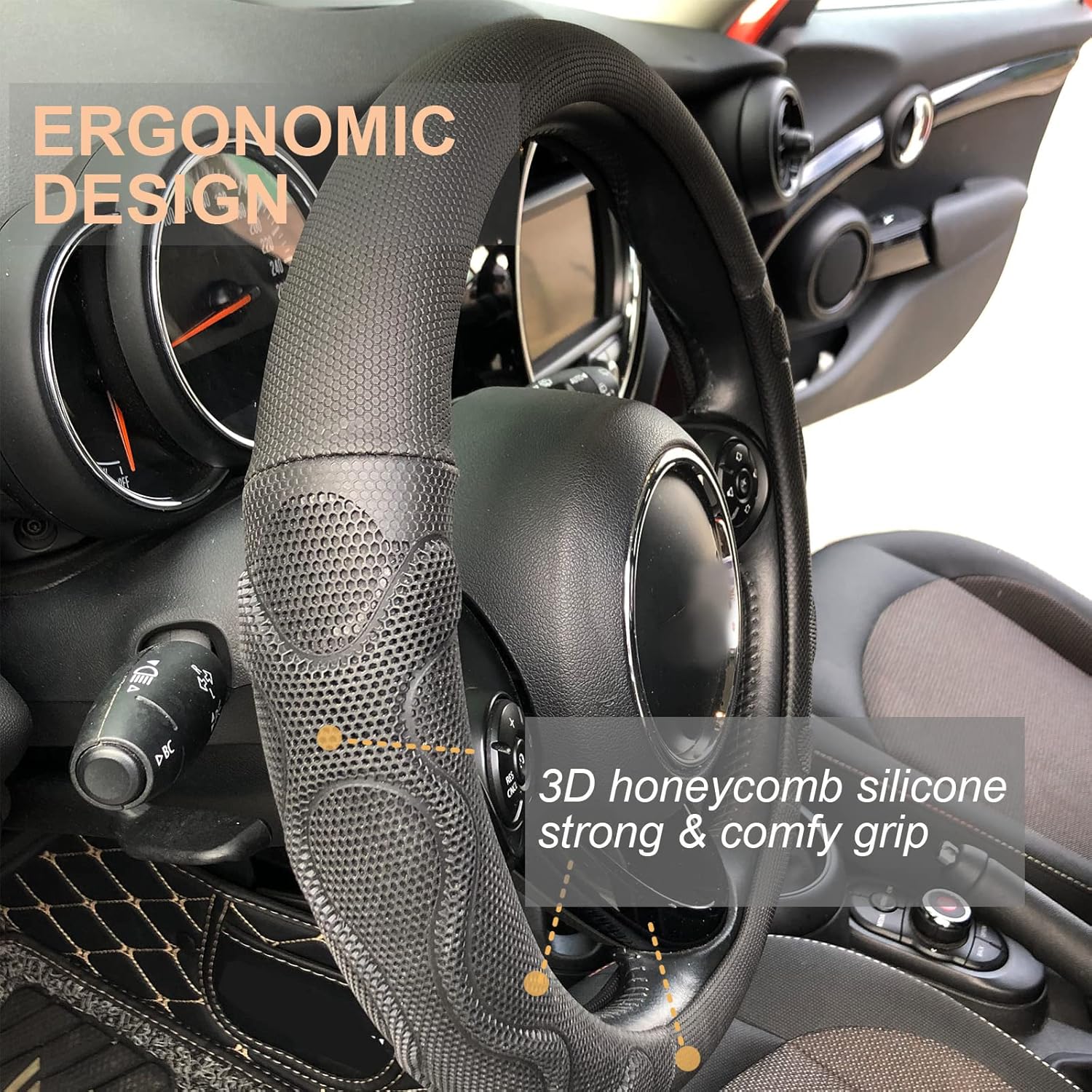 - Built to Last: Crafted with a solid rubber inner circle, textured microleather leather, and a 3D honeycomb silicone grip, this cover boasts a unique material combination that ensures exceptional durability. The silicone grip effectively relieving sweaty hands under hot weather. Enjoy a long-lasting and comfortable grip with PINCTROT car steering wheel cover.