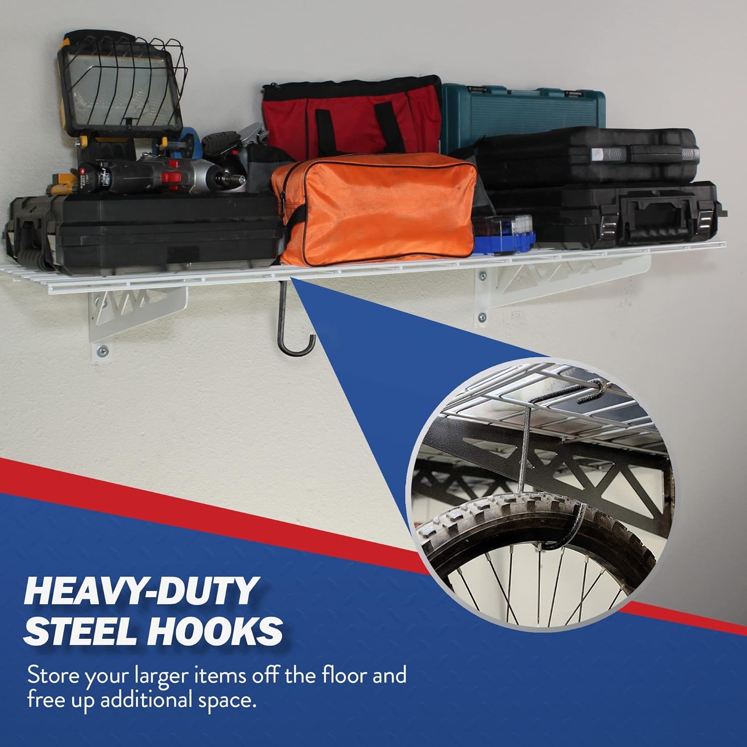 - MULTIFUNCTIONAL UTILITY RACK: Each pack includes (2) wall shelves and (4) versatile deck hooks that allow you to use them in many ways. Use them as storage racks and shelving in your basement, garage, pantry, or laundry room, and confidently hang your bicycle, golf accessories, canned goods, or yard tools and more to gain usable floor space.