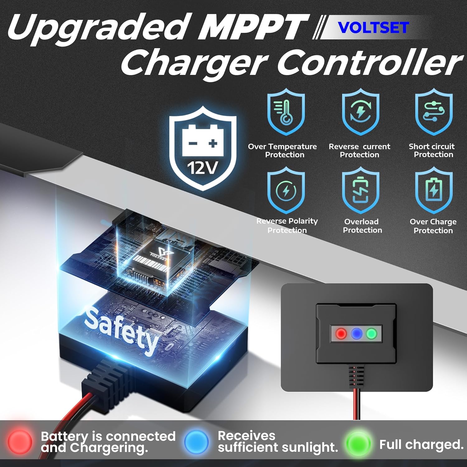 - Safe Charging System: Equipped with an advanced solar charger controller that prevents overcharging and deep discharging of batteries, ensuring a long-lasting power cycle. The IP67 waterproof controller safeguards your investment against water damage