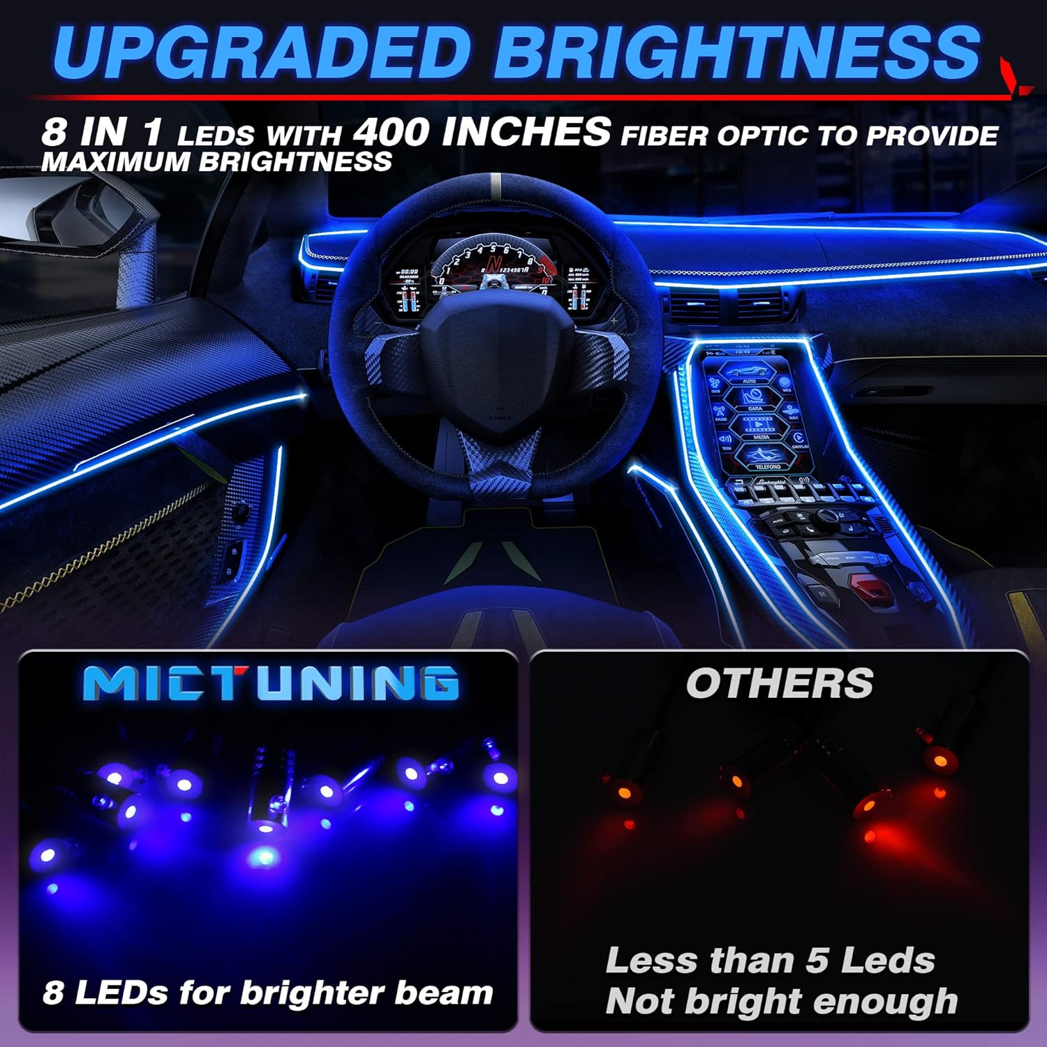 - â ă2025 Upgraded Version, 8 in 1 and 400 inch DesignăThis interior car light contains 8 LEDs and 400 inches of fiber optic tube. More LEDs and longer fibers than other 5-in-1s, which can be flexibly installed in any car