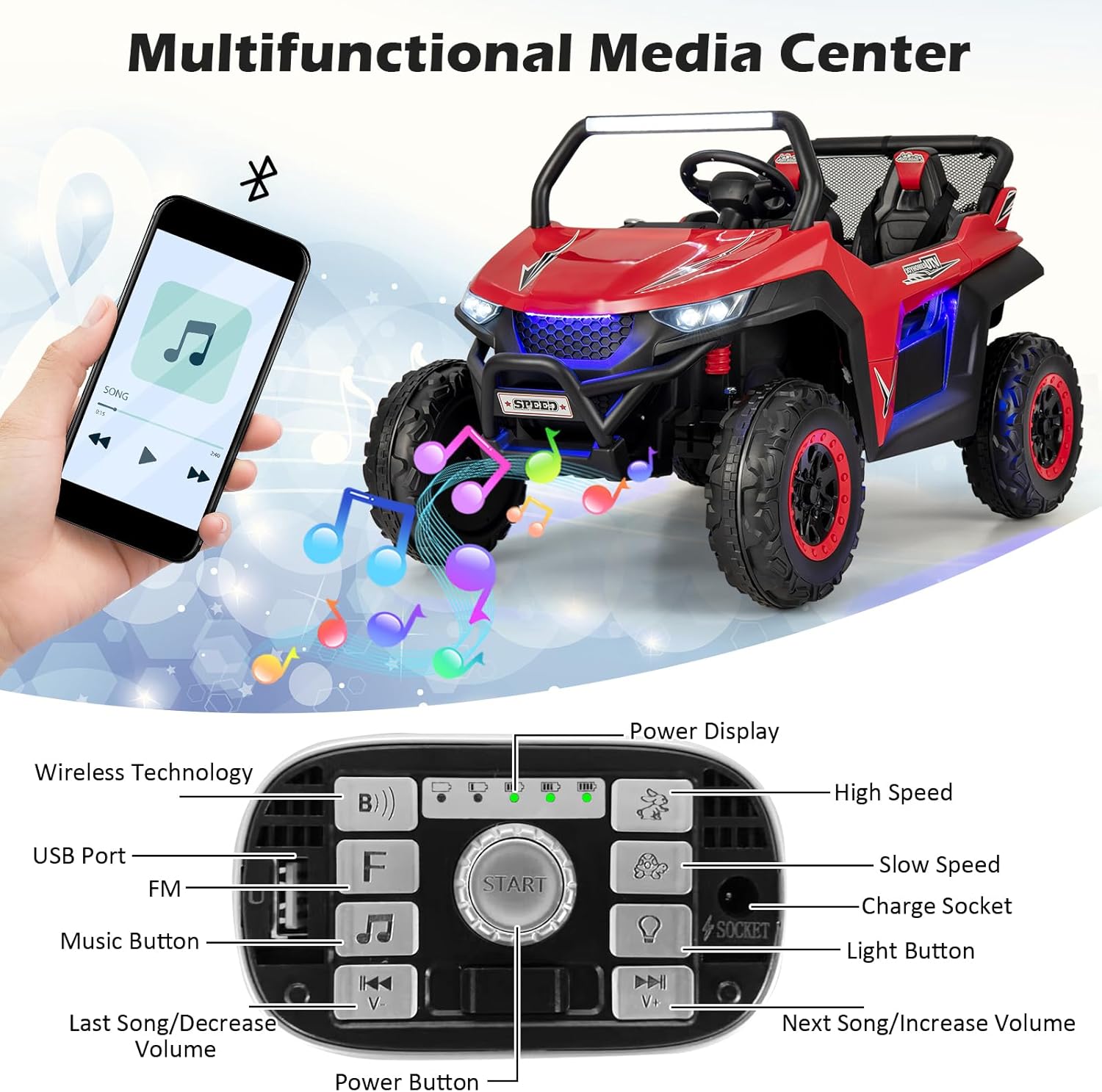Costzon 2-Seater Ride on Car for Kids, 12V Kids' Electric Vehicles w/Remote Control, 4 Shock Absorbers, Wireless Music & FM, 3 Speeds, Ambiance Lights, Electric Car UTV for Boys Girls (Red)