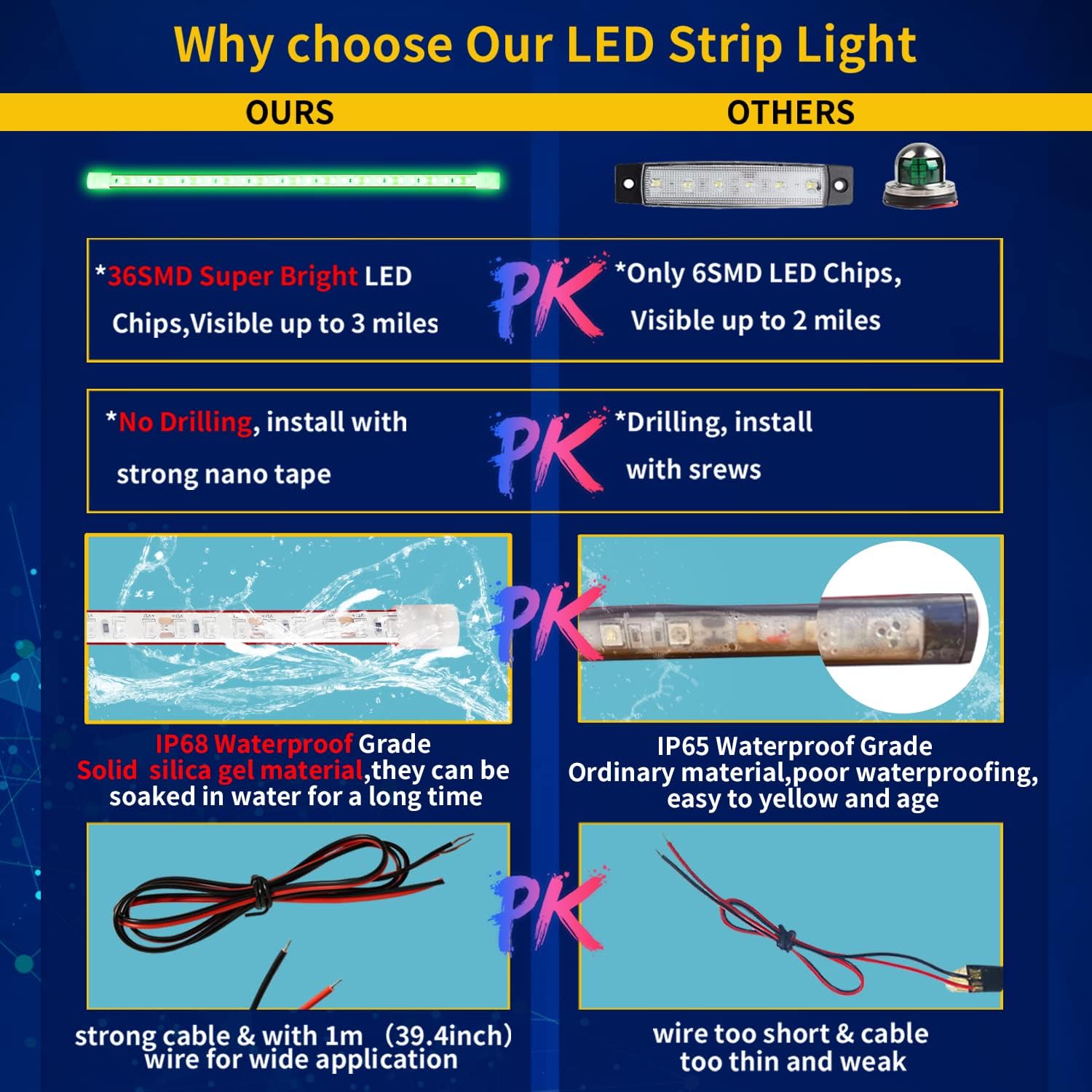 - Special Feature : IP68 Waterproof can work underwater, Cuttable ,Flexible, Super bright, With Strong Nano Tape, With 1 Meter (40 inch) Wire each strip light,No dark Spot IP68 Waterproof can work underwater, Cuttable ,Flexible, Super bright, With Strong Nano Tape, With 1 Meter (40 inch) Wire each strip light,No dark Spot