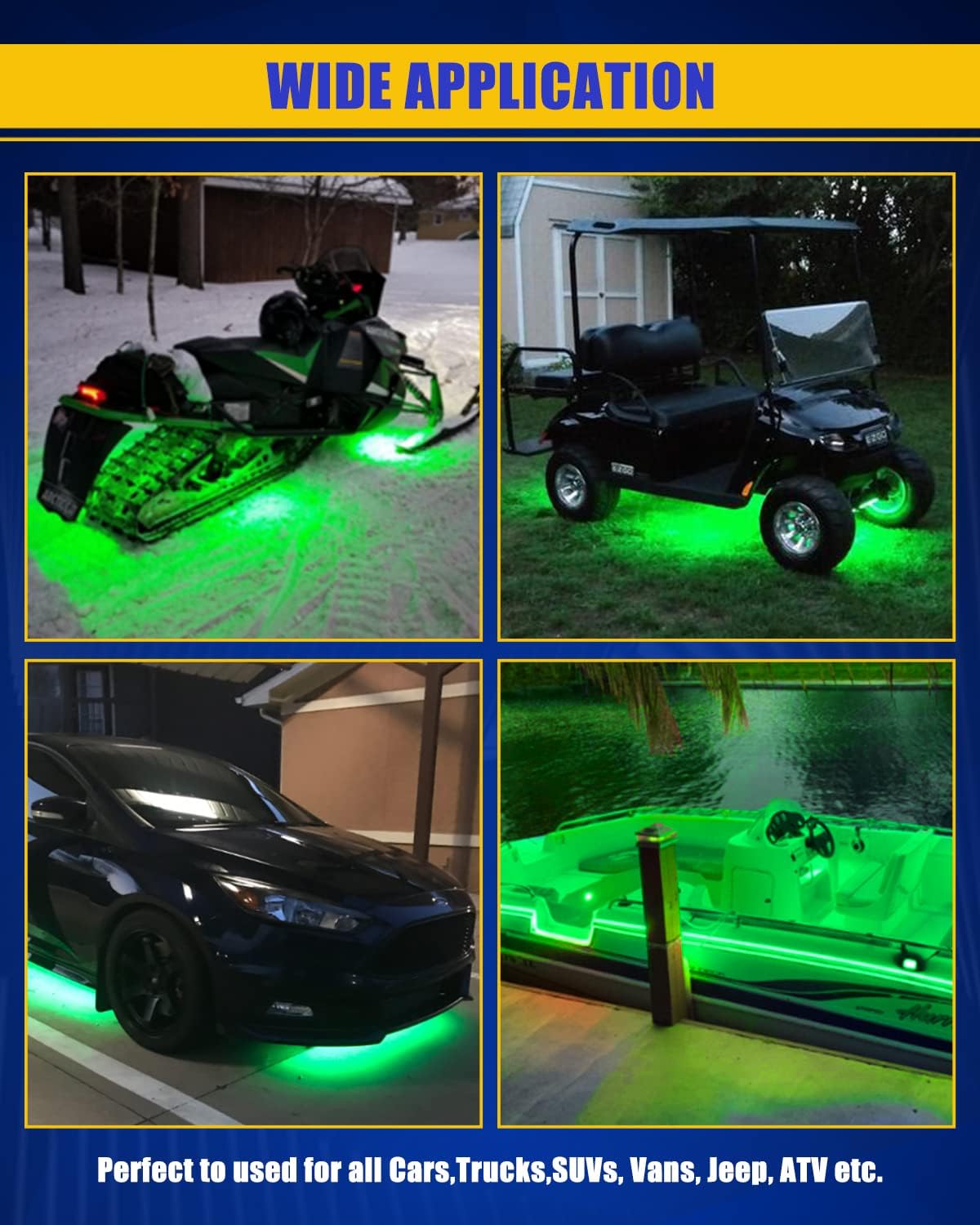 - 【WIDE APPLICATION】Our green led strip lights perfect to use for RV,car,boats,truck,suv,golf cart underglow motorcycle automotive,cargo trailer, under dash lighting interior & exterior front grille,boat deck light Courtesy Interior Lights Fishing Night atmosphere light and also for Home, Kitchen, Room, Bedroom,cabinet,bar,party decor accent lights.Simple design for you to decorate your automotive or home a beautiful, safety and romantic interior.
