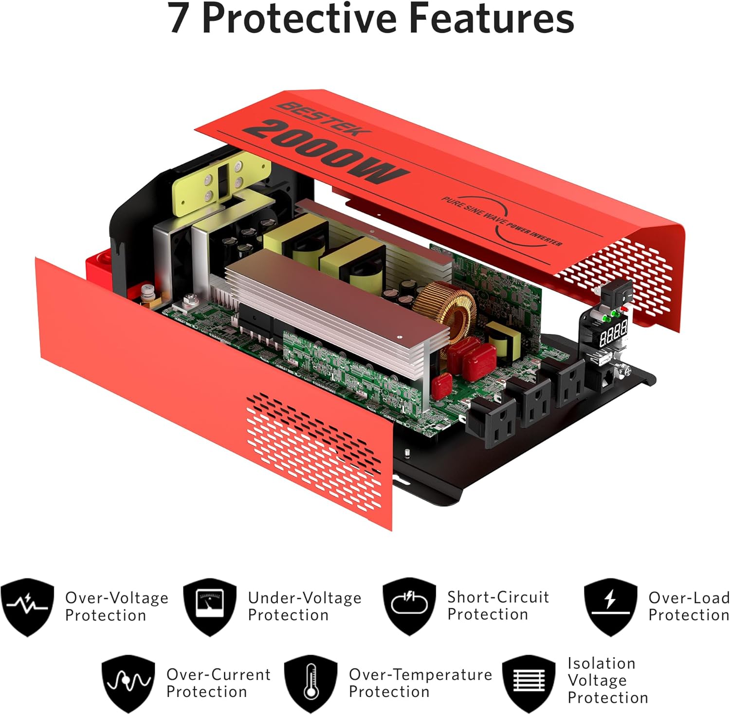 BESTEK 2000 Watt Pure Sine Wave Power Inverter 12V DC to 110V/120V AC Converter for Home, RV, Truck, Off-Grid Solar Power 3 AC Outlets Car Inverter with One 2 USB Port Type-C with Remote Control