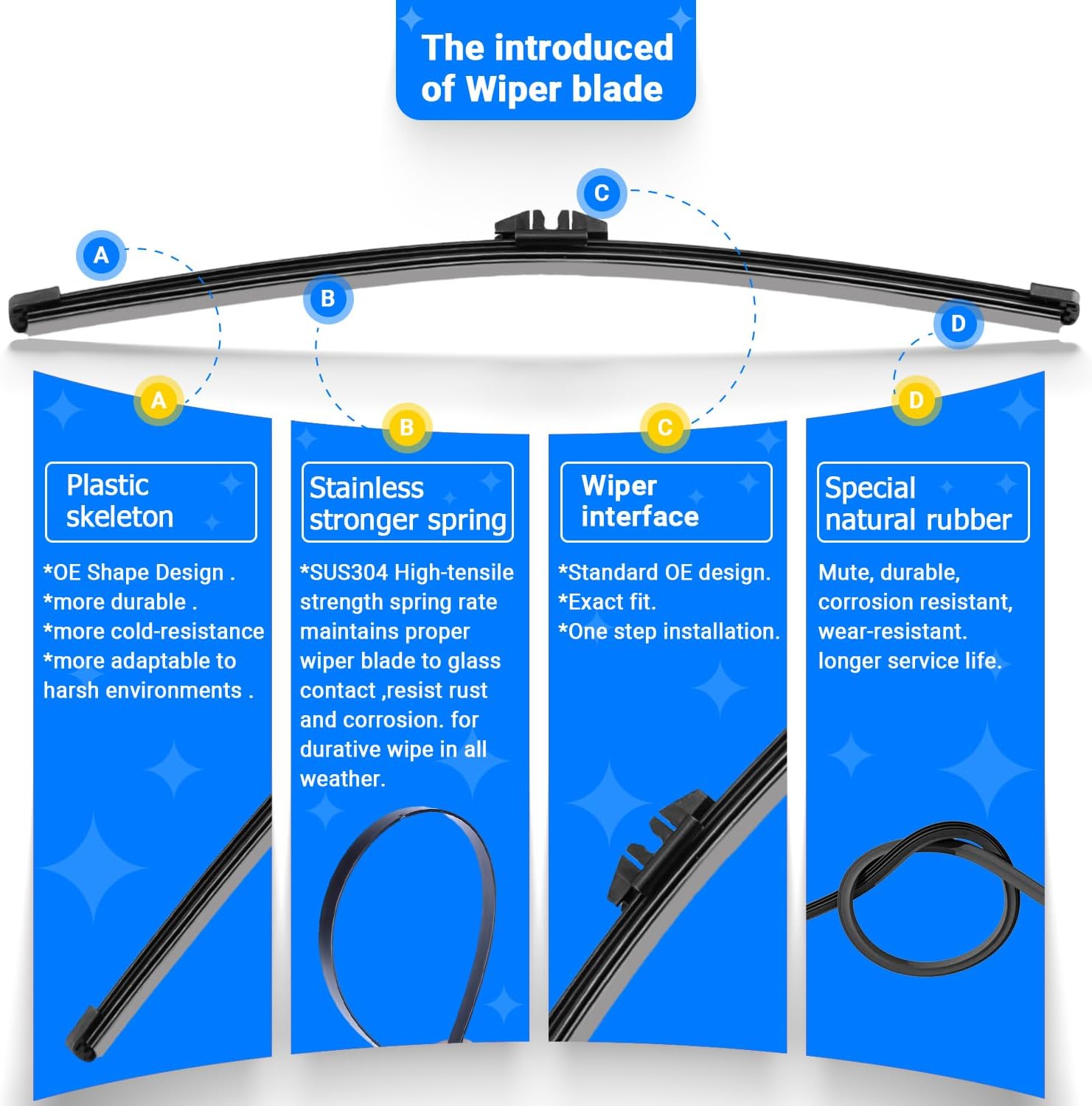 - {WIPER PERFORMANCE}: Natural rubber material making sure the wiping is the best, quiet wiping without judder or squeaking, resistant and a long service life.