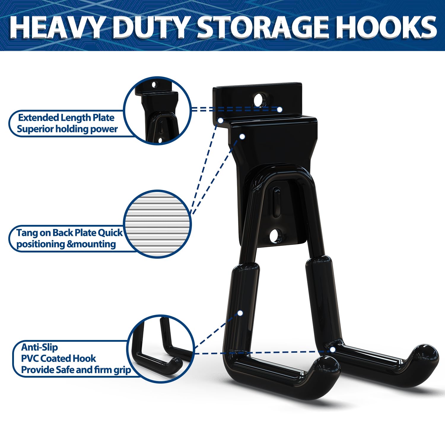 - Upgrade Design-Triangle 3 Welding Spots: Different from other similar hooks for slatwall with only 2 welding spots, we designed 3 welding spots to connect the garage slatwall with the base, offering higher security and no worrying about the rear steel panel splitting or falling off, a perfect choice of wall hooks for hanging heavy duty