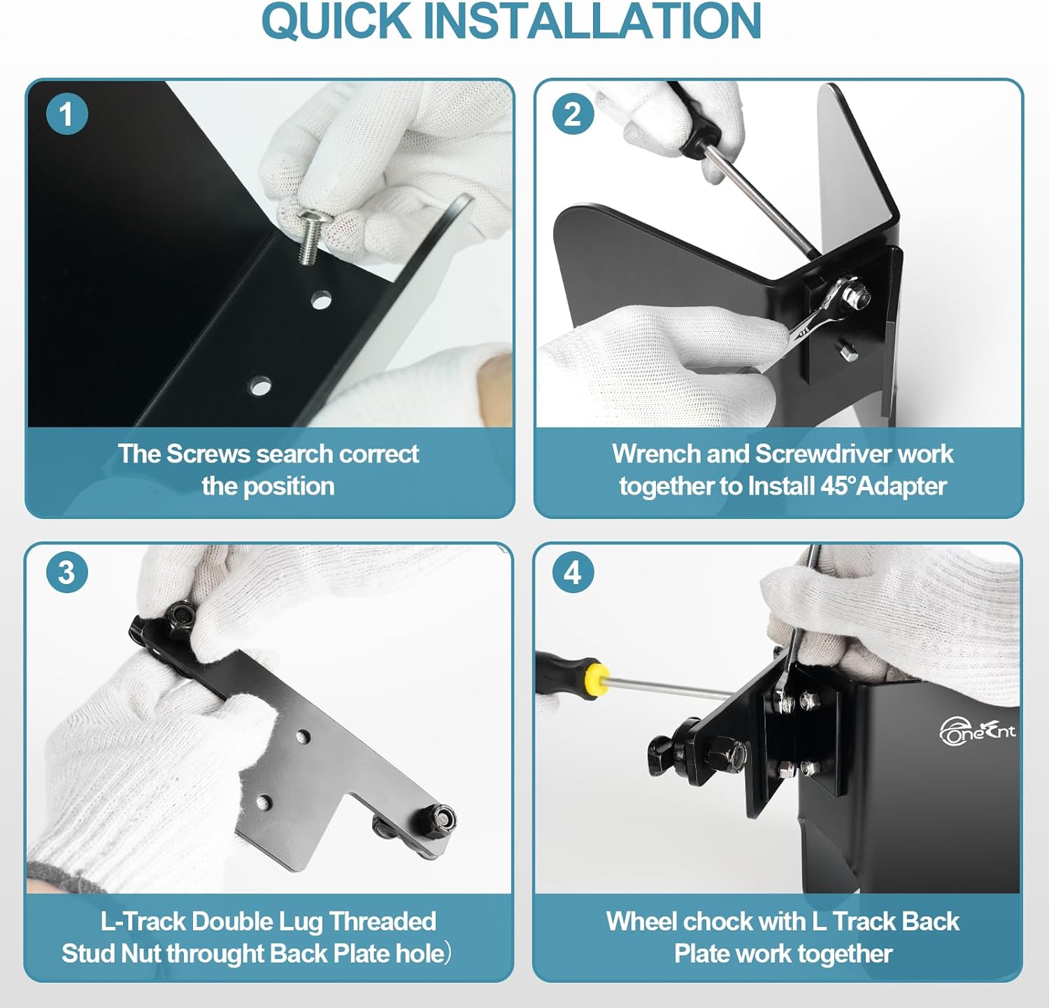 • Package Included:2 Pcs L-Track Wheel Chock, 2 Pcs 45 Angle Adapte, 4Pcs L-Track Double Lug Threaded,10 Pcs Screws and Nuts, 1 Pcs Wrench and 1 Pcs Screwdriver,1Pcs Back Pla