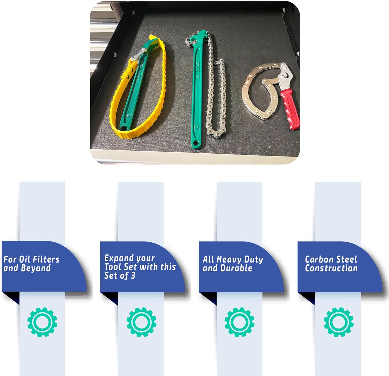 - Filter Wrench Tool Set - variety of wrench options to get the right grip on an oil filter. Useful for multiple applications such as plumbing, pool equipment, jar opening, faucet pipe, etc.