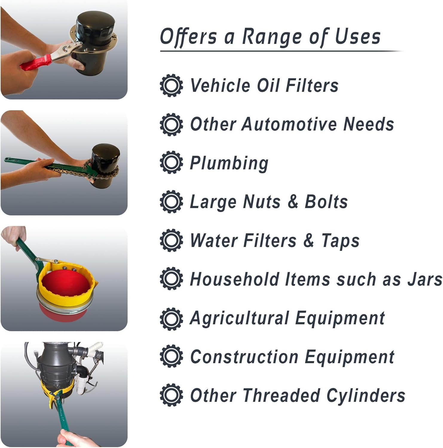 - 15 Inch Chain Wrench - heavy duty carbon steel with long 15" handle for better torque. 28" (711mm) Adjustable Chain Length