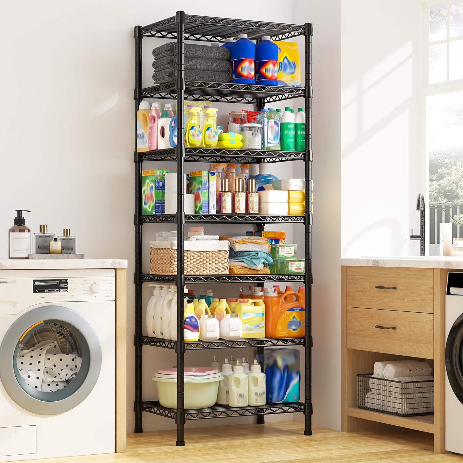 - 【1176 LBS Super Sturdy Metal Shelving 】Back to school supplies! This metal shelves for storage made of heavy duty steel wire,and has undergone special coating treatment.Every solid thickened shelving with extra stiffener,can easily bear 168LBS each shelf ,1176 lbs bearing capacity totally.which means this metal shelving unit will always be your reliable partner