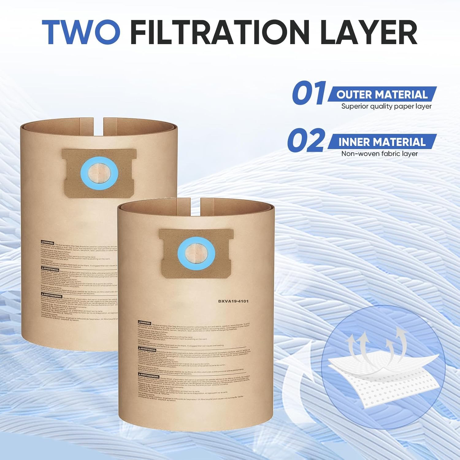 - 【EXCELLENT PERFORMANCE】:Our DXVA19-4101 DXV09P Vacuum Bags Replacement for Dewalt Adopts a Multi-layer Structure with the Perfect Combination of the Outer Paper Layer and Inner Micro Filtration Layer, Ensures Sturdiness While Effectively Capturing 99.9% of Debris, Pet Dander and Other Dust as Small as 0.1 Microns