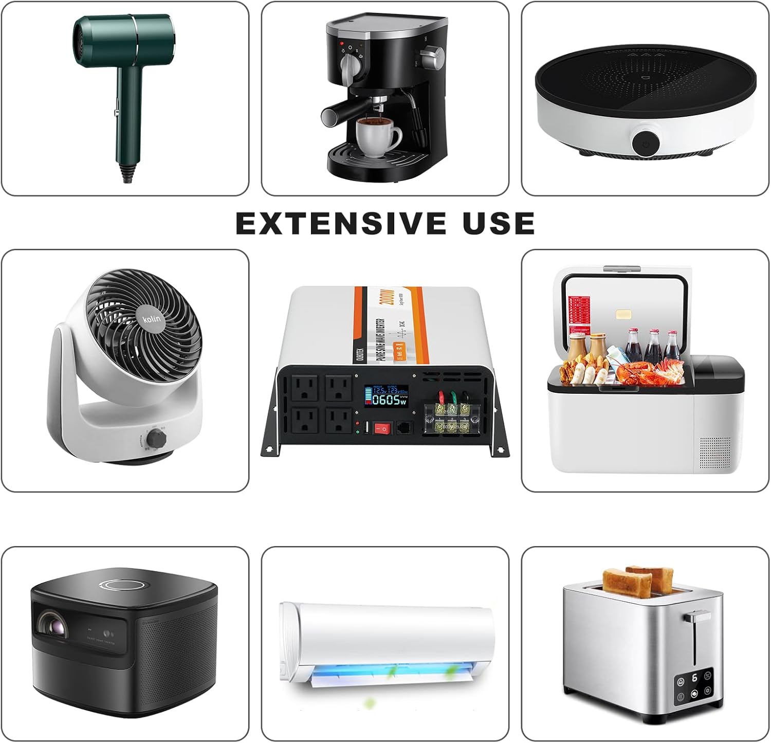 - SAFETY PROTECTION: The 2000W true sine wave inverter features advanced technology, safety design and all-round security protection to protect your devices. It has multi-protection against low voltage, over voltage, over load, short circuit and over temperature. The cooling fans start working when the inverter internal temperature reaches 113β/45β or loading power around 50%, it keeping clean and lower the temperature.