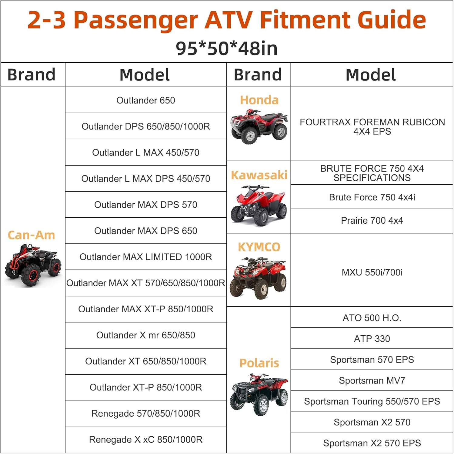 - ăUniversal four wheeler Modelsă: The ATV cover fits the following models: Polaris Scrambler 1000, Sportsman 570/XP1000/Touring Models, Honda Rubicon, Yamaha Grizzly 700, Kodiak 700, Can-Am Outlander 570, Arctic Cat Alterra TRV 700, Suzuki KingQuad 750, and more.