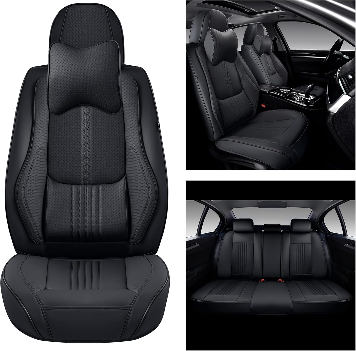 Car Seat Covers Full Set, Front and Rear Seat Covers for Cars, Waterproof Leather Auto Seat Protectors with Head Pillow, Car Seat Cushions Fit for Most Sedans SUV Pick-up Truck, Black