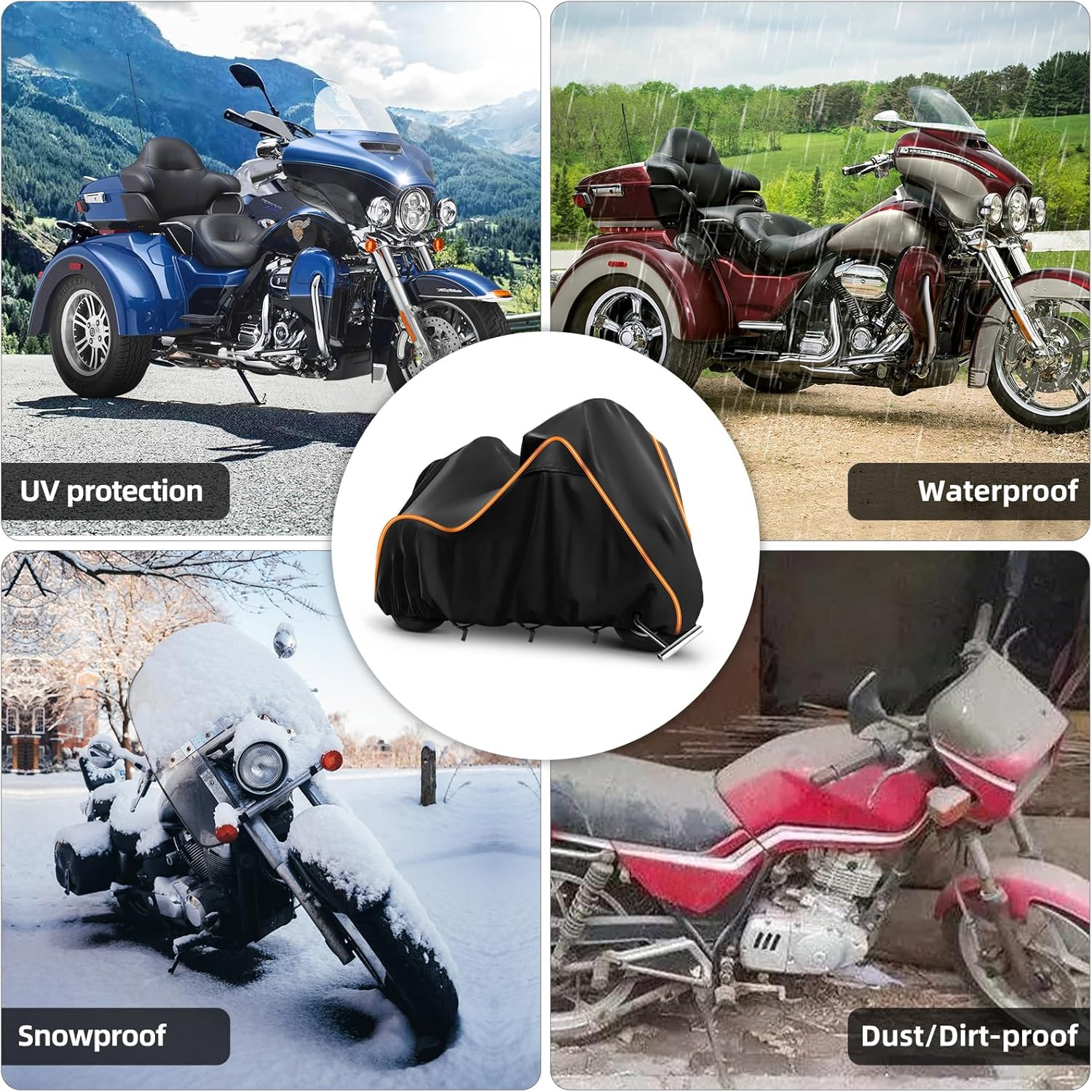 - ăCompatible withăThe motorcycle cover compatible with the Trike Models including freewheeler, Tri Glide, and CVO Version, compatible with Goldwings, Chidftain, Challenger, Elite.Please make sure your bike model and the length before purchase and make sure your motorcycle body is dry and clean before putting on this bike cover.