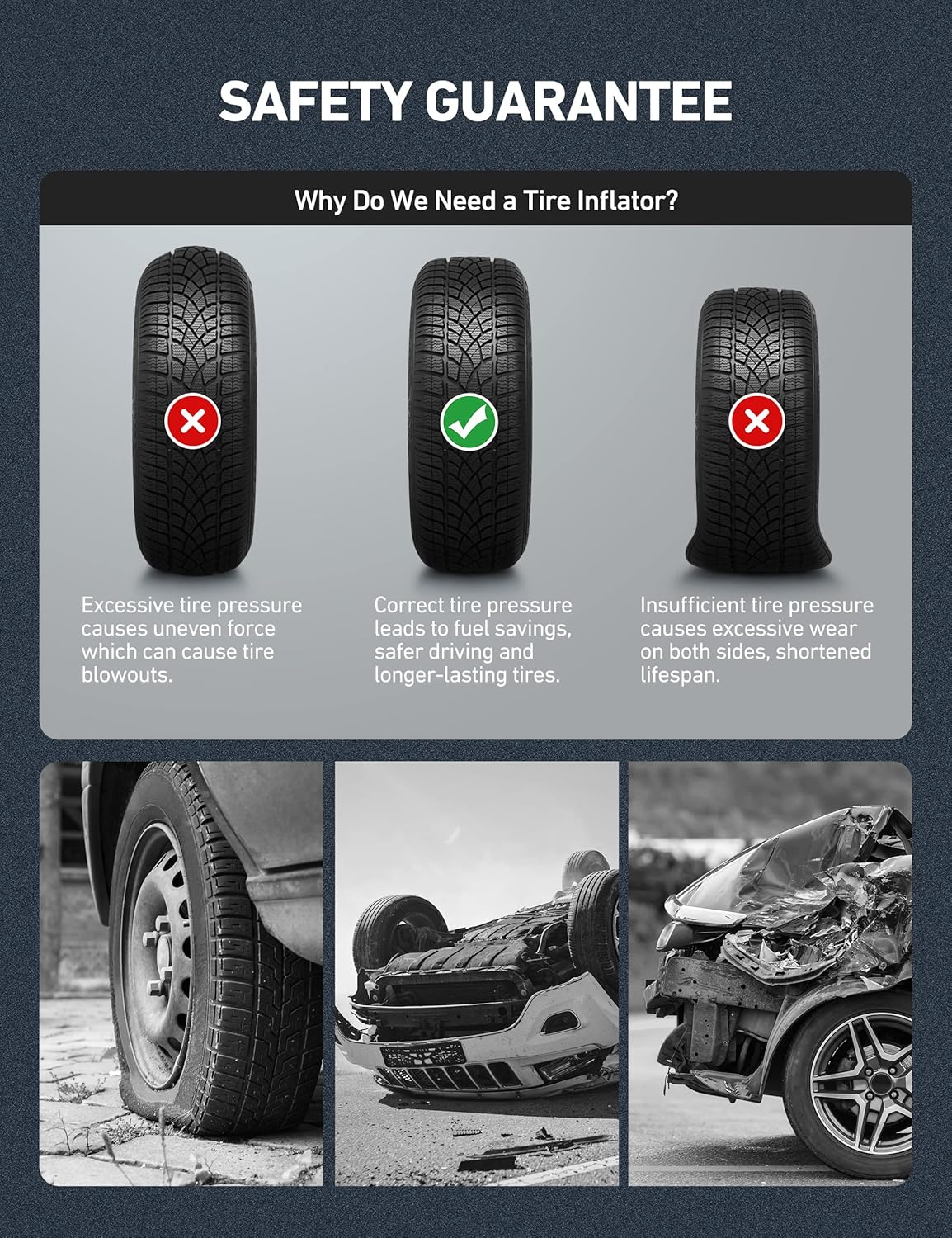- INCREASED SAFETY: Properly inflated tires provide better performance in all weather conditions, decrease the likelihood of flats, explosions, and crashes; Increase your MPG, save money on fuel/tire wear, and drive safer.
