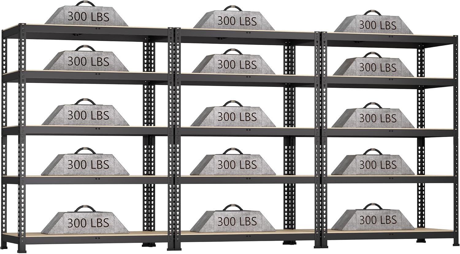 - - Built to Hold More: Featuring a heavy-duty metal frame and premium MDF boards, BuxWellBang garage storage shelves Max. load capacity is 300 lbs per layer shelf (evenly distributed) without buckling or breaking, 5 tier shelves' total max load capacity is 1500 lbs. The rock-solid construction of storage shelf ensures greater strength, longevity, and stability—a storage rack you can trust for the long hauls