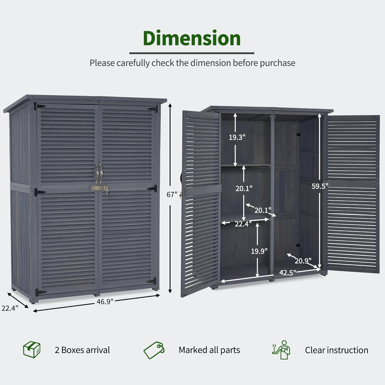 - Multiple Storage Spaces: The outdoor storage cabinet has 2 shelves for various items, 1 large space for long tools.