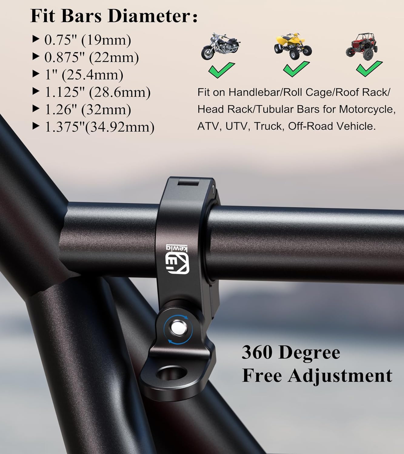 - Fit on 0.875"/1"/1.125"/1.26"/1.375" tubes for ATV, UTV, truck, boat, motorcycle, off-road vehicle and farm vehicle. It is applicable for roof racks, roll cages, bull bars, roll bars, head racks, handlebars and more. ( Please Note: Before purchasing, please measure the diameter of the mounting rail to confirm whether this clamp mount fits your rail ).