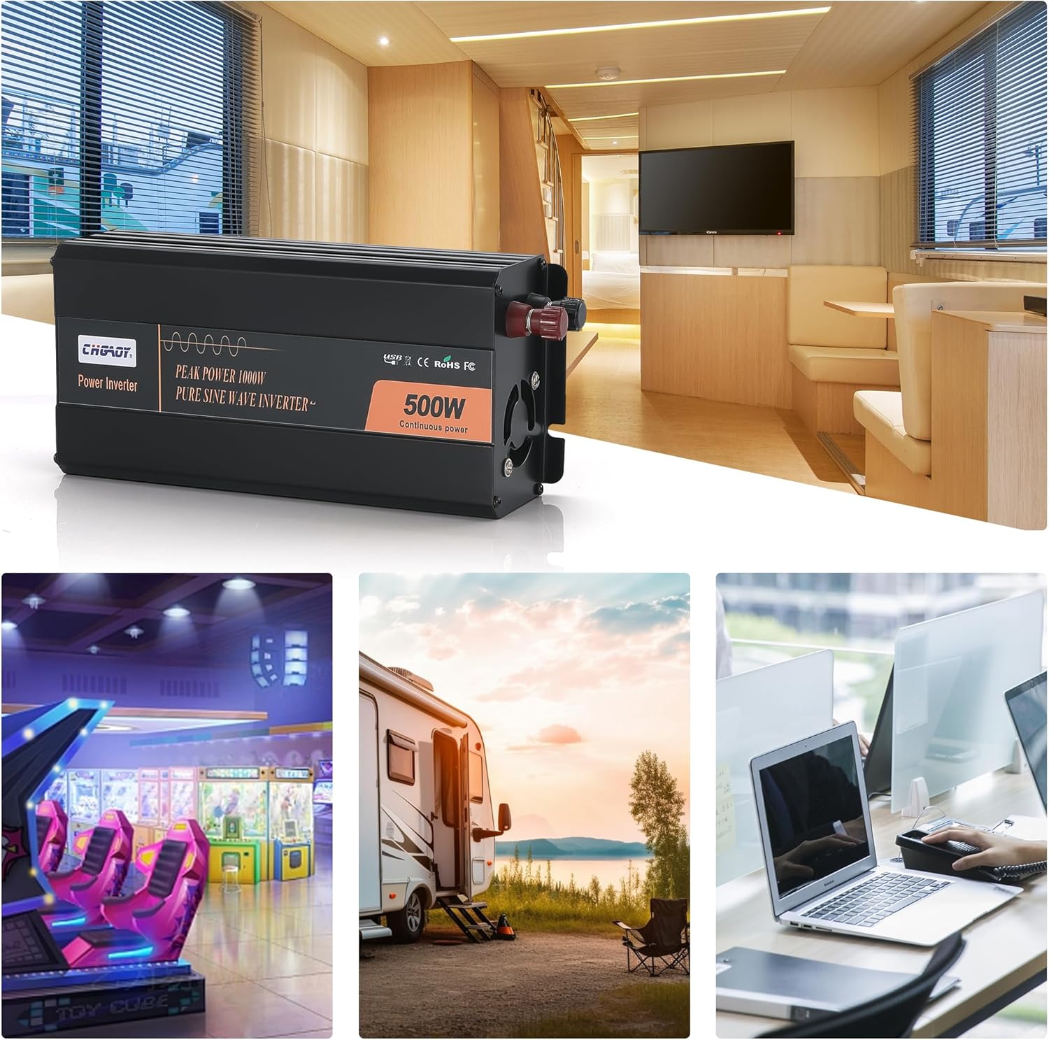- 💯【The Powerful 500W Inverter】 CHGAOY power inverter provides 500W continuous DC to AC power supply from 12V to 120V, and 1000W peak surge during load startup. The inverter has two 120V AC power sockets and a 2.1A USB fast charging interface, which can meet your various power needs. Our 500W inverters are pure sine wave type which can avoid wasting energy during transmission.
