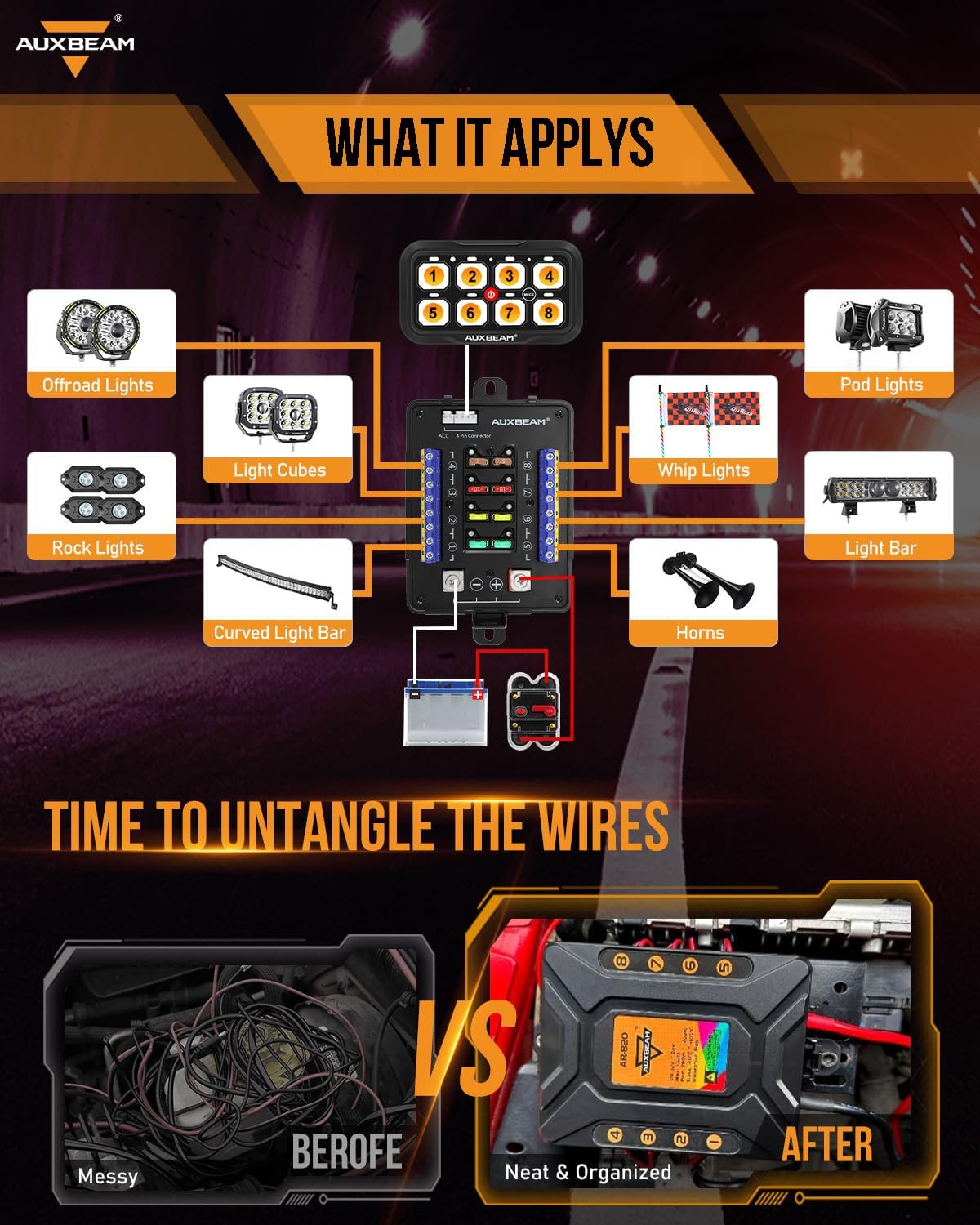 - Solid-State Relay & Enhanced Safety : Auxbeam RGB 8 gang switch pod built-in solid-state relays and circuit breakers ensures stable power delivery and overload protection. Dustproof covers, 60+ stickers, and plug-and-play wiring (10ft extension) make installation effortless. Ideal for off-road lighting systems, itâs engineered for reliability.
