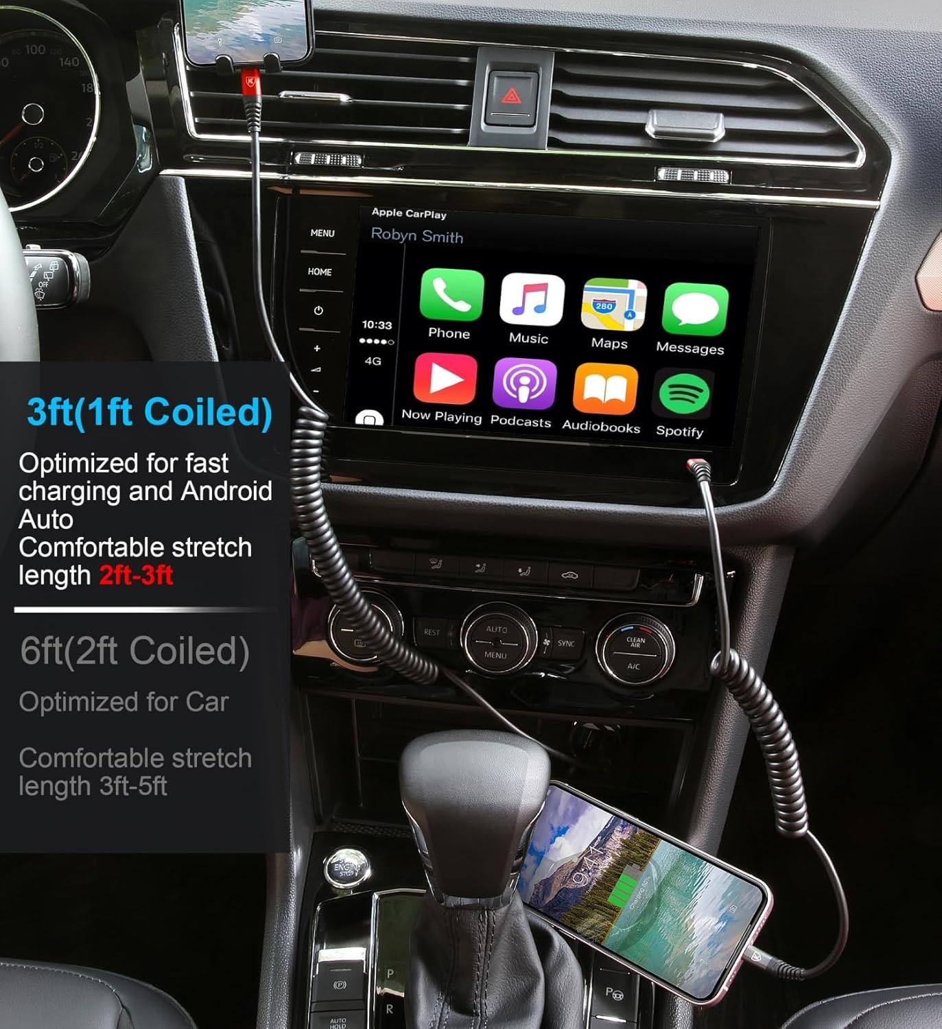 - Elastic Coiled Lightning Cable : Coiled lightning cable 1FT (stretchable to 3FT, comfortable stetch length 1.5ft-2ft) and bounce back to normal length. You can use it in the front seat of your car and store your iPhone device in a compartment or on the phone holder of the car.