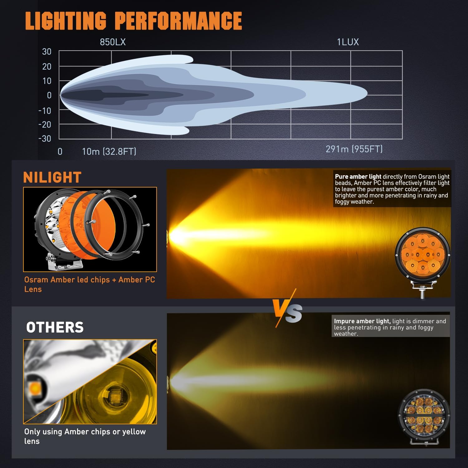 - ăUltra Insane BrightnessăEach light use 10PCS high quality 5W Osram led chips, total 50 watts, specially designed optical yellow lens and refractive cup, outputs super bright 1958K amber light, 850Lux@10M, 1Lux@ 954.7FT. Providing you a more clearly and safe driving in foggy snowy, rainy weather, preventing the fog/snow/dust from reflecting the light back into driver's eyes
