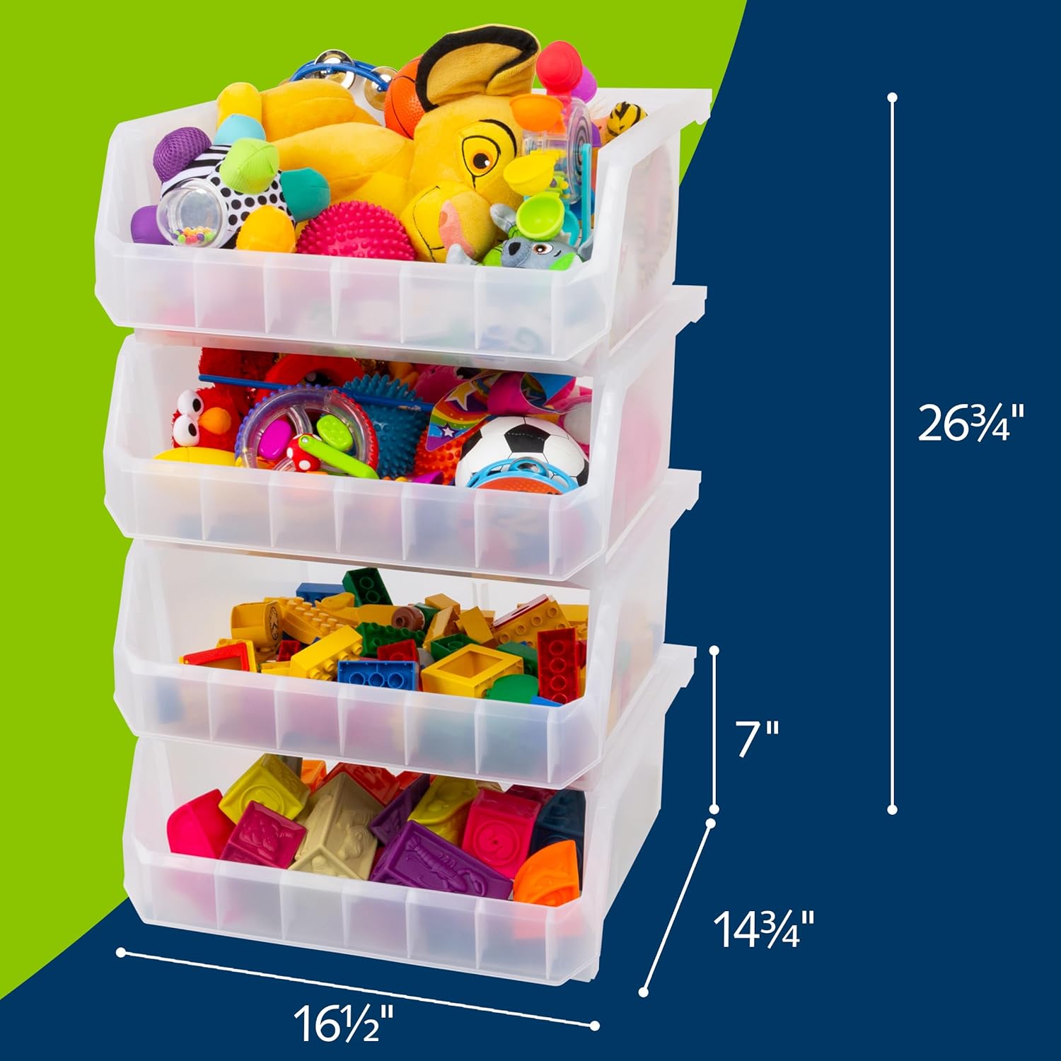 Plastic Containers for Organizing and Storage Bins for Closet, Kitchen, Office, Garage or Pantry Organization, Stackable Bins, Extra Large (14.8" x 16.5" x 7"), 4-Pack, Clear